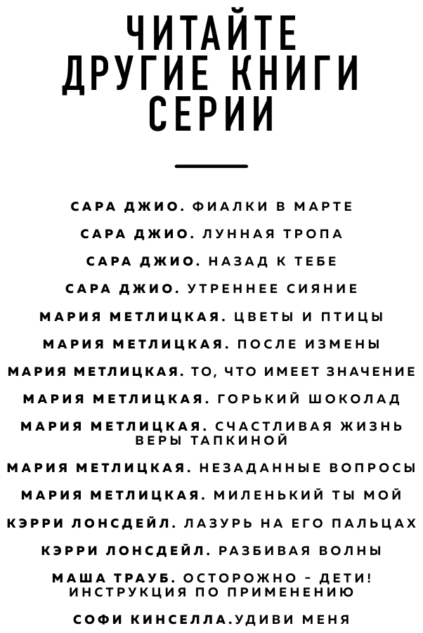 Книги Марии Метлицкой как будто списаны с наших жизней - небольших радостей, бытовых забот, уютных семейных вечеров у телевизора и запаха флоксов на даче, счастливых встреч и расставаний, со старых воспоминаний и планов на грядущее лето. Мария Метлицкая показывает нам "маленькую жизнь" негромких людей - в ее героях мы узнаем себя, своих родных и знакомых. "Обычные люди мне интереснее олигархов или, скажем, богемы. Я ведь тоже - самый что ни на есть обычный человек. Живу такой же жизнью, что и вы. Я тоже жена, мама и бабушка", - говорит Мария. И в этом - один из секретов ее успеха. Ее рассказы примиряют с трудностями и дают надежду на счастье.