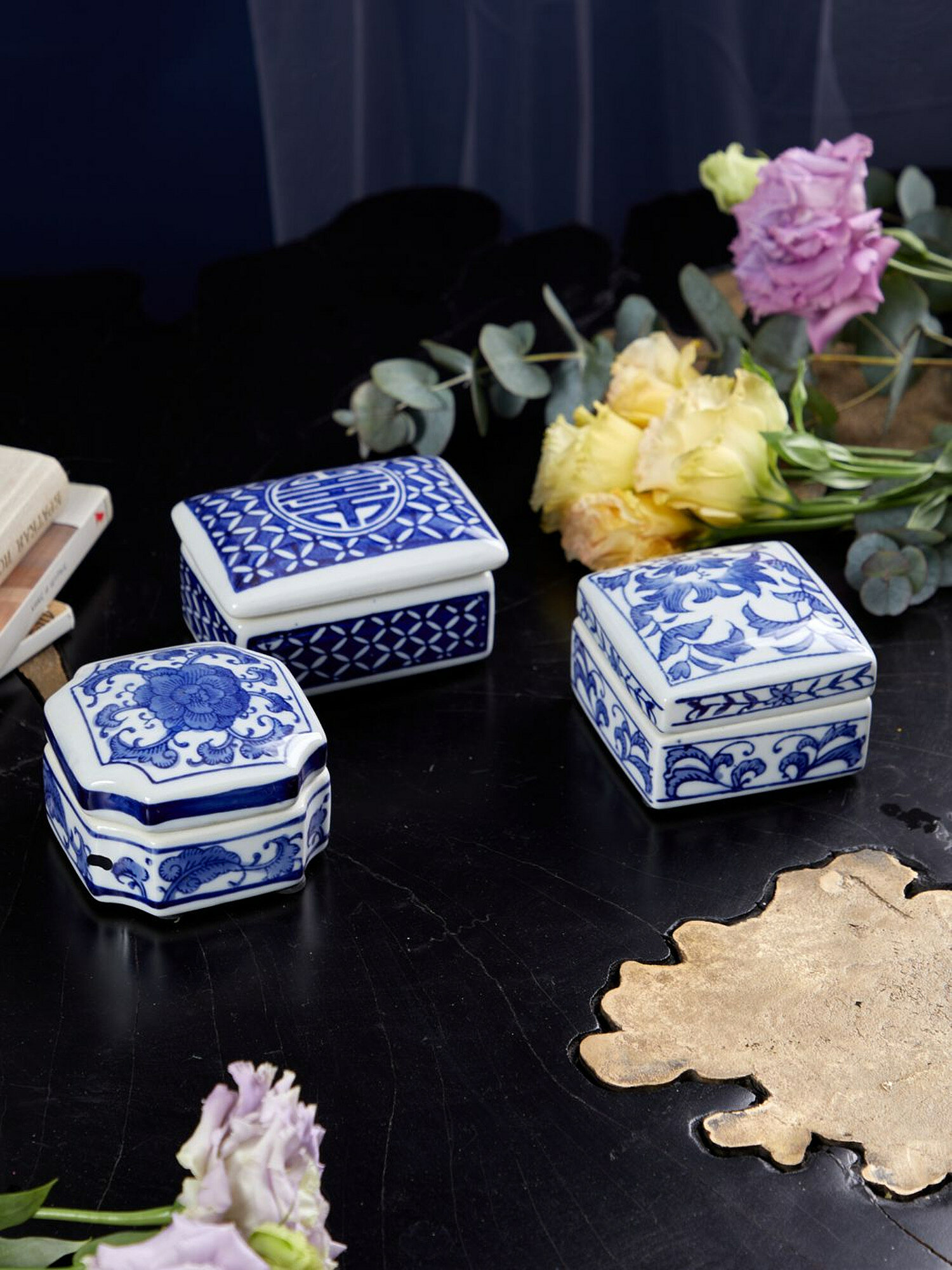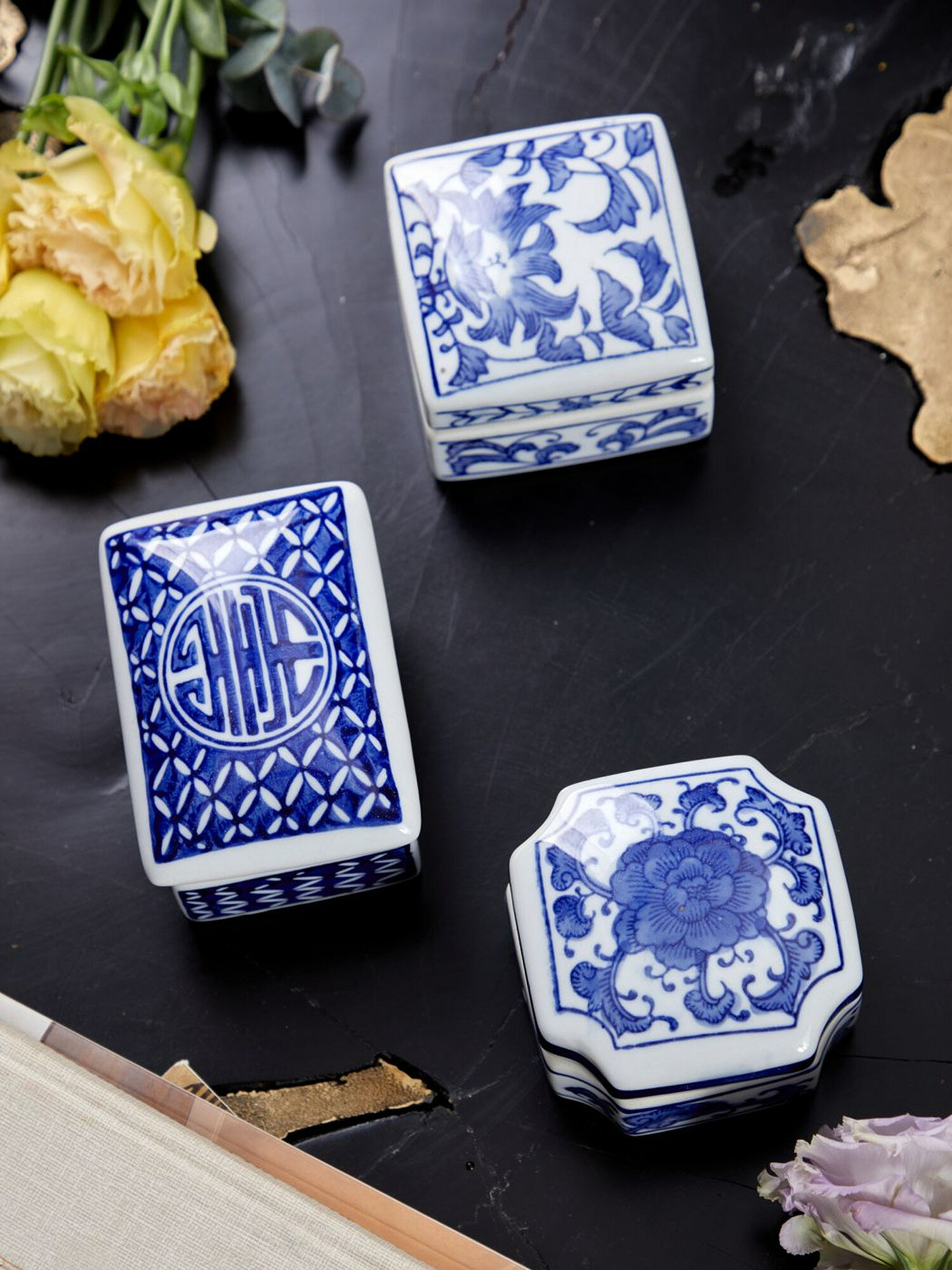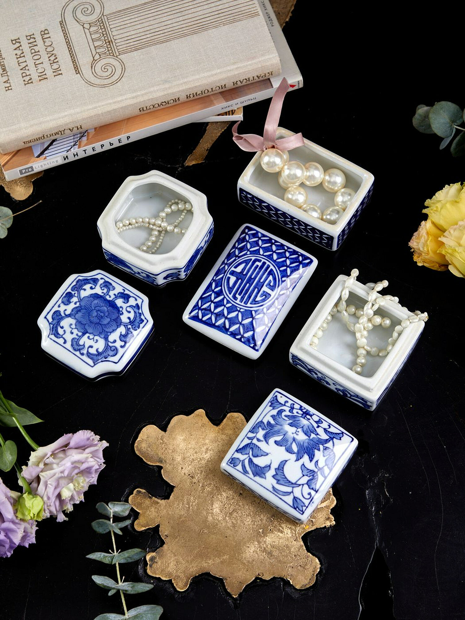 Шкатулки в бело-синей цветовой гамме из гладкого фарфора в глянцевой глазури. Поместите их в гостиной или спальне, чтобы придать роскоши вашему пространству.