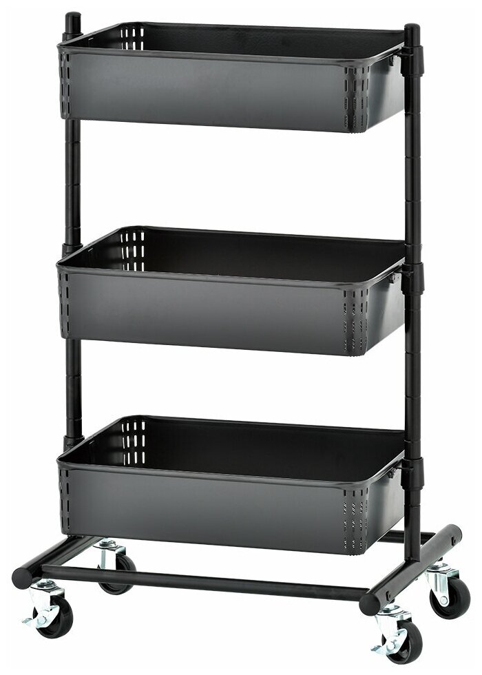 Металлическая этажерка на колесиках со стопорами, 3 корзинки, регулируемые по высоте. В стильном черном цвете.