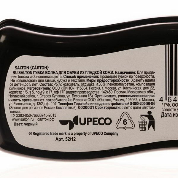 | Способ применения | Снимите крышку, без нажима проведите губкой по поверхности обуви. После использования плотно закройте крышку. Не использовать для замши, нубука или ткани. |