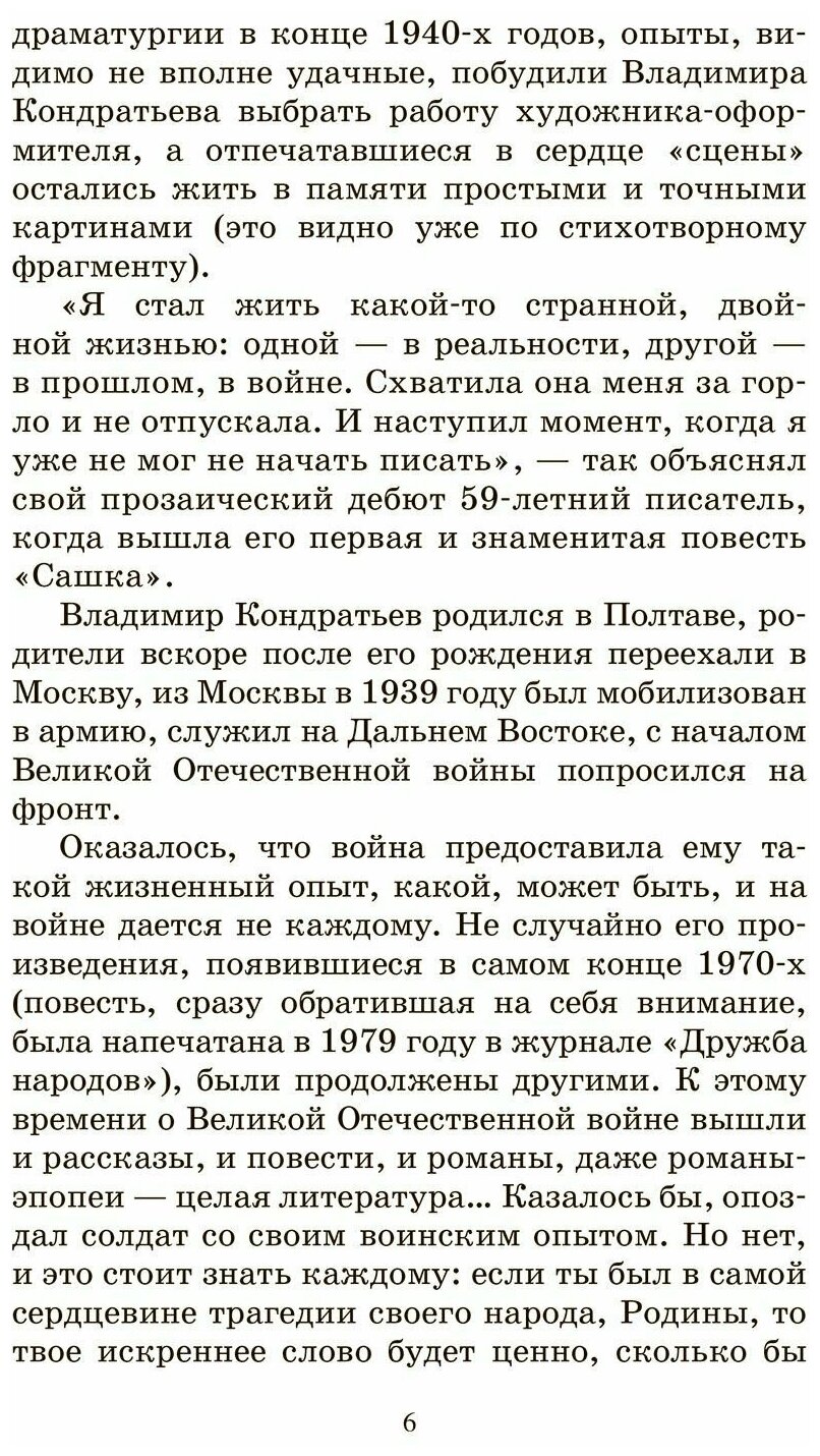 В книгу вошли две повести замечательного русского писателя, участника Великой Отечественной войны Вячеслава Леонидовича Кондратьева (1920-1993): "Сашка" и "Отпуск по ранению". Эти произведения были написаны в самом конце 1970-х годов, спустя более тридцати лет после окончания войны. Критика встретила их восторженно - за правду войны, за то, что героями были простые русские парни, бесхитростные и открытые. Перед читателем открывается их внутренний мир, в котором идут те же самые бои, невидимые, но не менее важные, чем на настоящем поле сражения.
