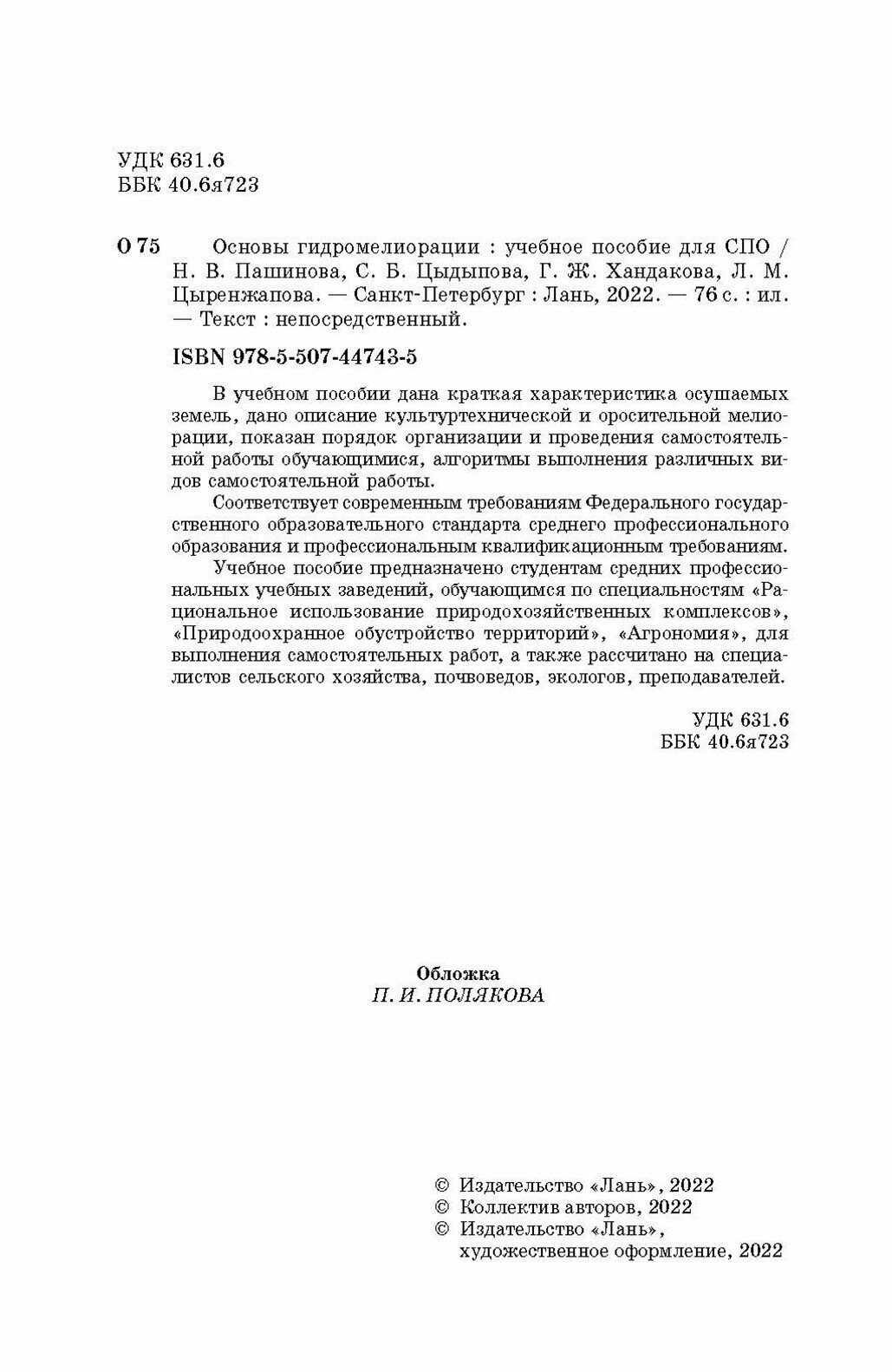 Основы гидромелиорации. СПО (Пашинова Надежда Валерьевна, Цыдыпова Саяна Базыровна, Хандакова Гэсэгма Жаргаловна); Лань, 2022