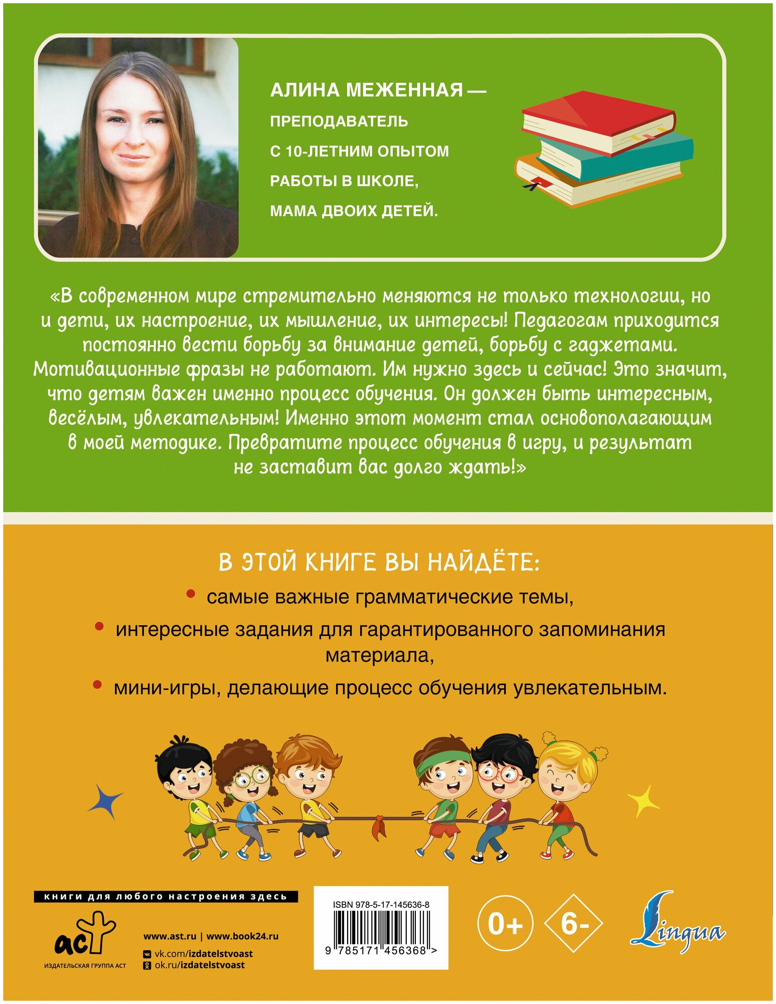 Алина Меженная - преподаватель английского языка с 10-летним опытом работы в школе. Автор подходит к процессу обучения творчески и применяет в своей работе современные эффективные методики. Изучение английского языка в такой форме исключает заучивание и гарантирует быстрое усвоение информации.