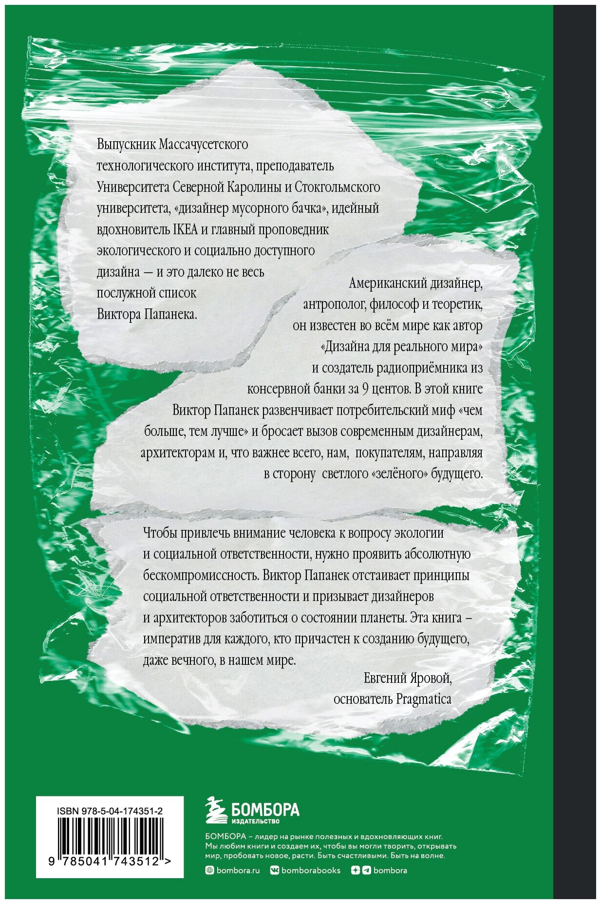 Эта книга расскажет, в чем заключается цель дизайна и архитектуры, как дизайнеры могут делать более чистые продукты и почему потребитель должен всегда ожидать большего. Виктор Папанек, американский дизайнер с многолетним стажем, философ и теоретик, на различных примерах, от упаковок до парковок, покажет, что настало время более сложного устойчивого дизайна, требующего вдумчивости и заботы о нашей Земле.