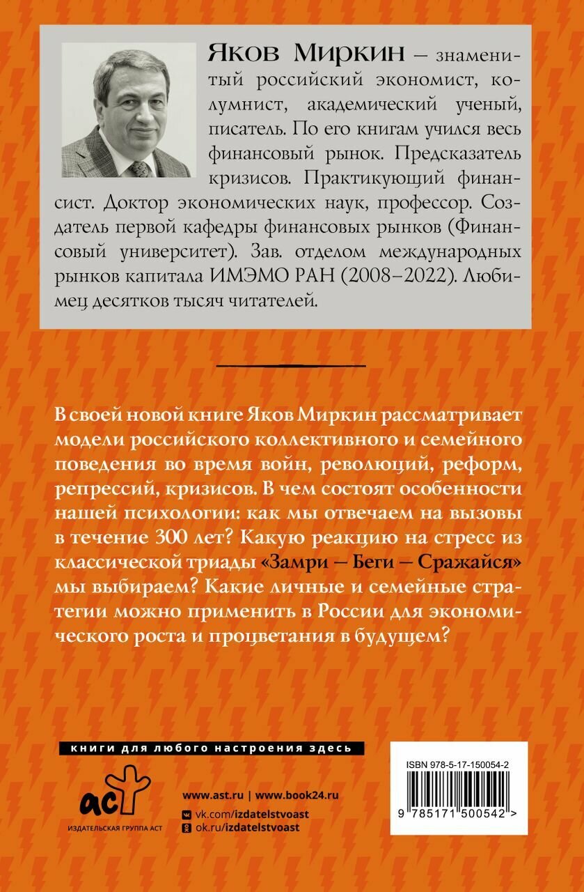 В своей новой книге знаменитый экономист и колумнист Яков Миркин рассматривает модели российского коллективного и семейного поведения во время войн, революций, реформ, репрессий, кризисов. В чем состоят особенности нашей психологии: как мы отвечаем на риски и вызовы в течение 300 лет? Какую реакцию на стресс из классической триады "Беги, замри, сражайся" мы выбираем? Какие личные и семейные стратегии можно применить в России для экономического роста и процветания в будущем?
