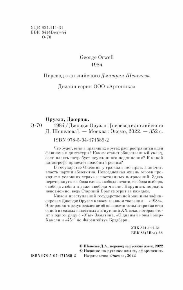 Книга: 1984. Оруэлл Дж. (Джордж Оруэлл); Эксмо, Редакция 1, 2022