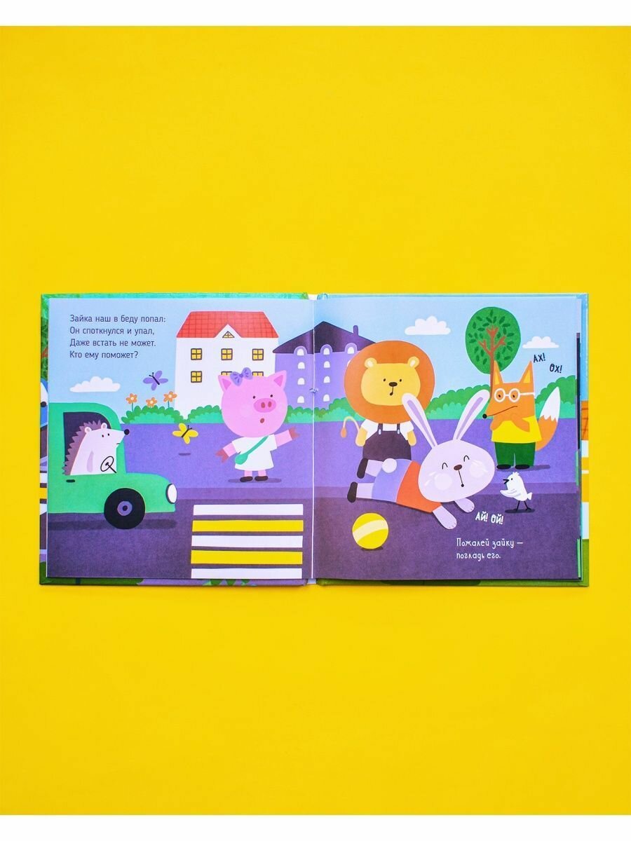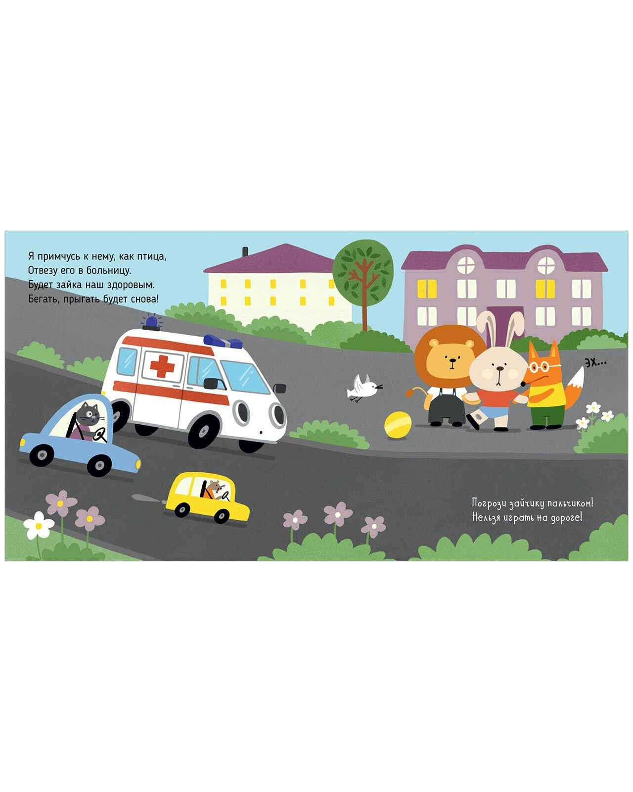 Эта книга содержит замечательные стихи про то, как скорая помощь спасает зайчонка, который получил ушиб. Страницы книги выполнены из плотной бумаги, обложка твёрдая.