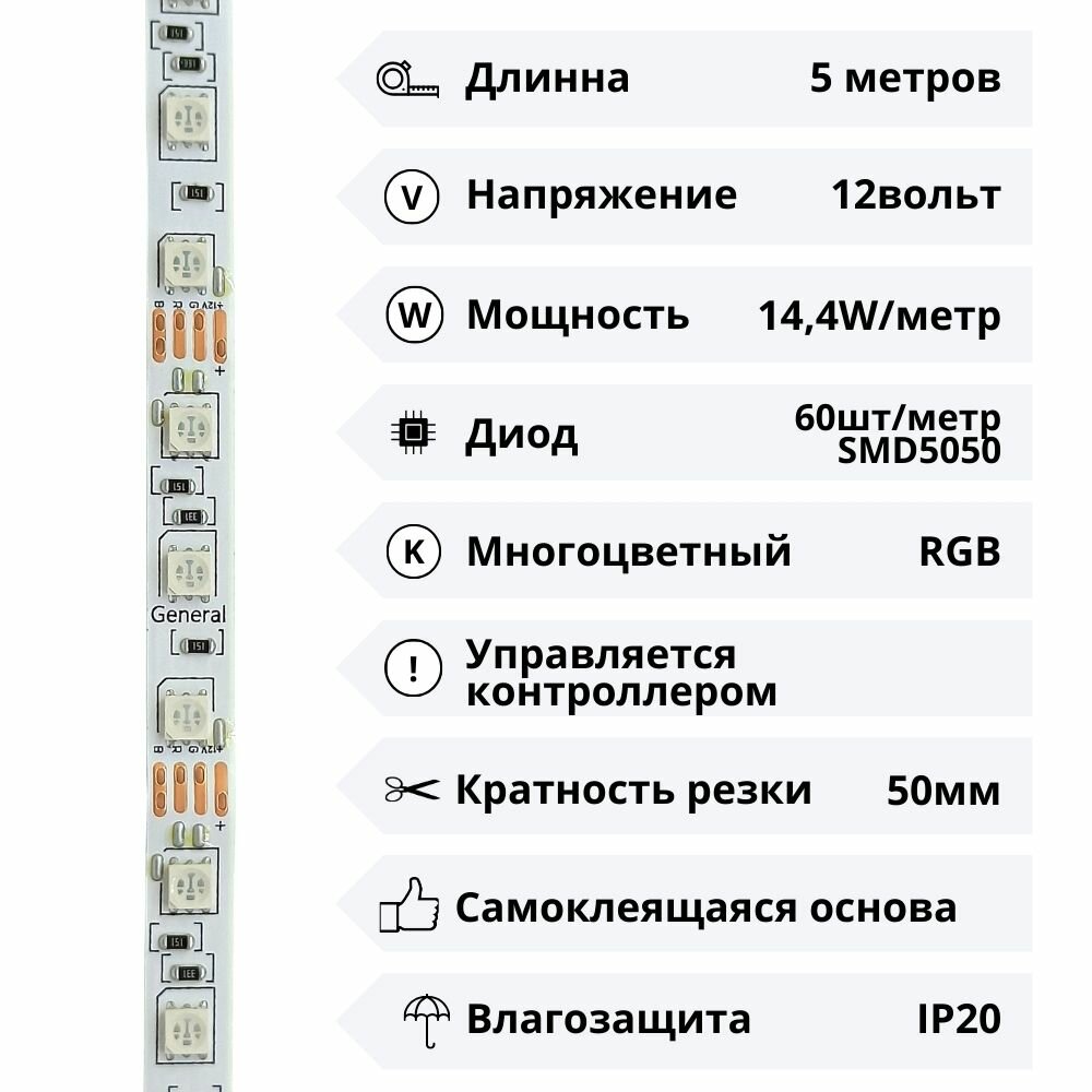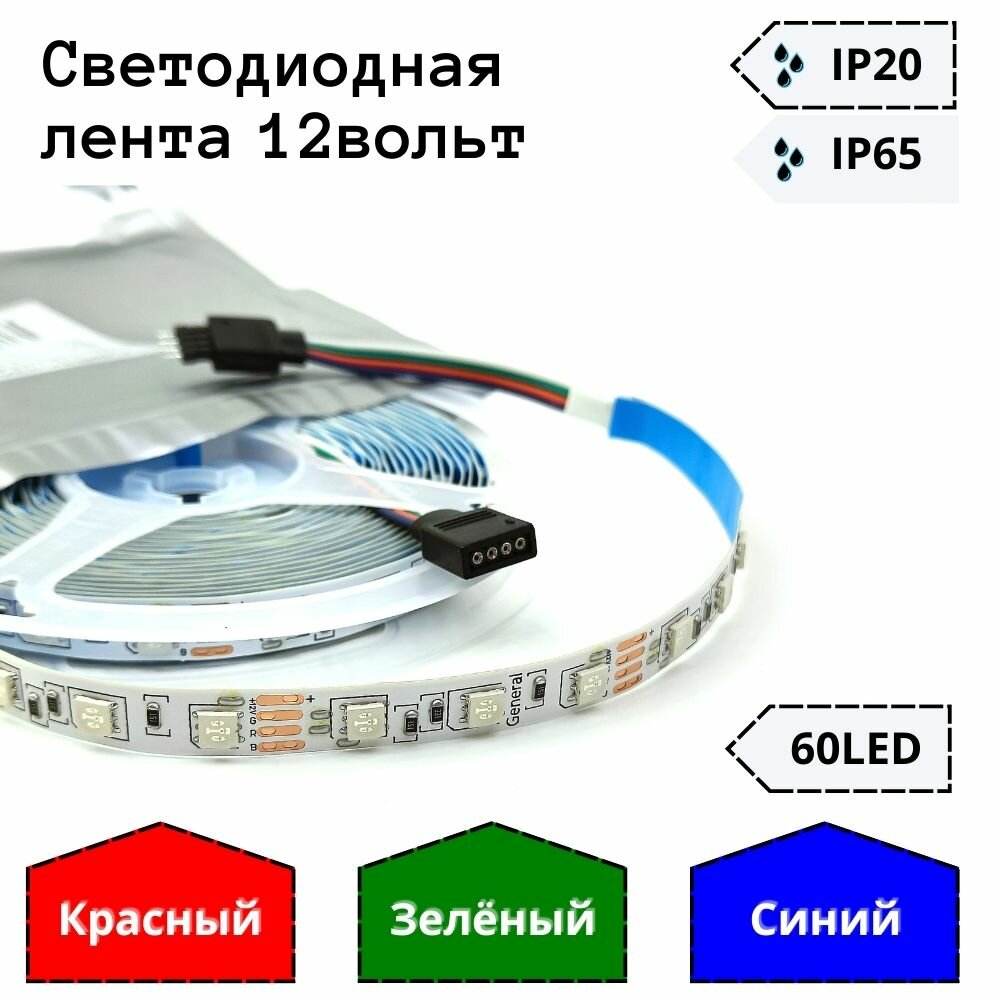 5м. Светодиодная лента RGB 5050 14.4W 12V 60LED/m IP20 General GLS-5050-60-14.4-12-IP20-RGB (5038)
