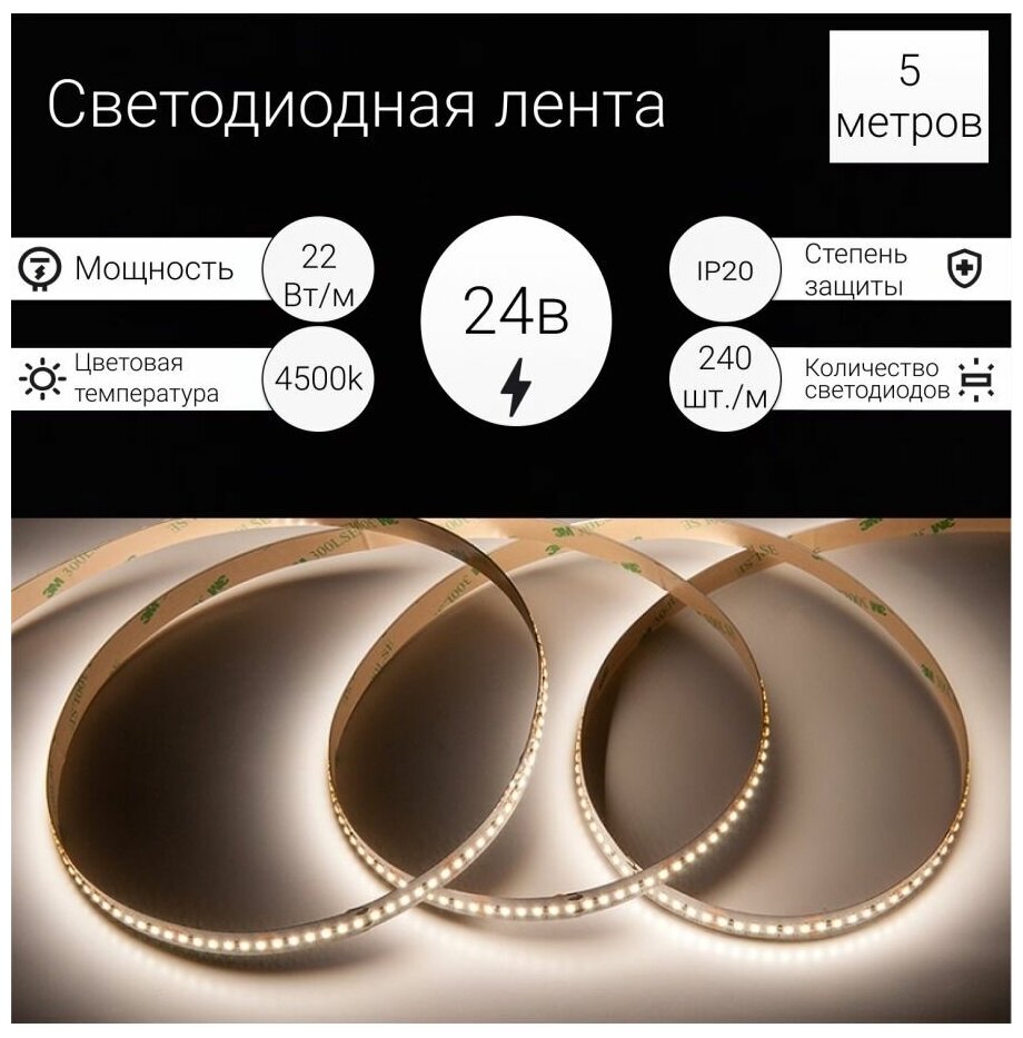 5м. Светодиодная лента белого цвета 4500K 2216 22W 24V 240LED/m IP20 General GLS-2216-240-22-24-IP20-PRM-4 (502741)