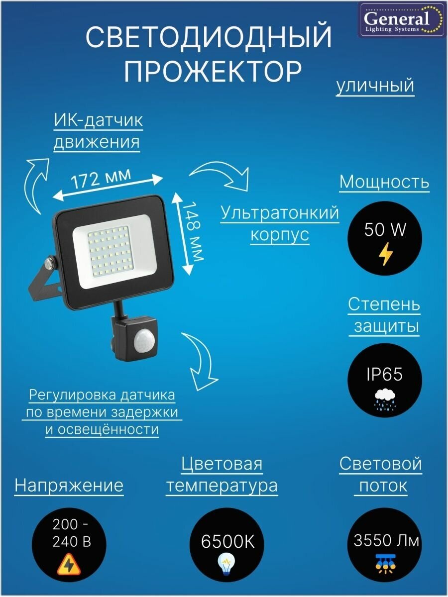Светодиодный прожектор с датчиком движения General GTAB-50BT-IP65-6500-IFR 403135