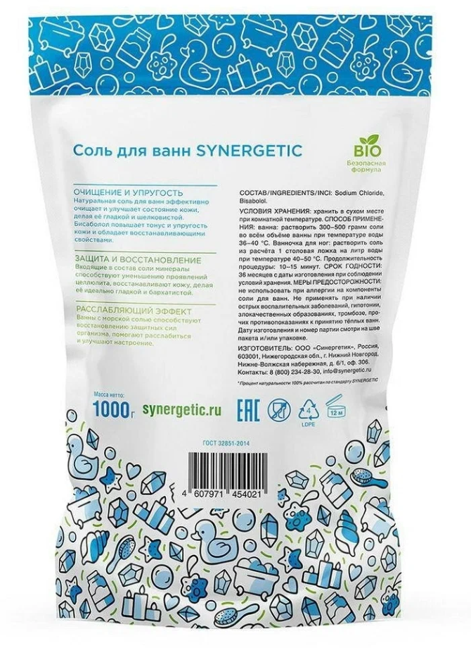 | Полное наименование | Соль для ванны Synergetic Relax & Skin tone 1 кг |