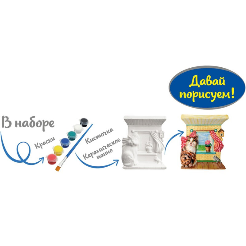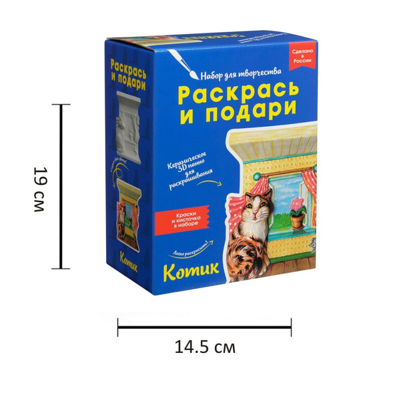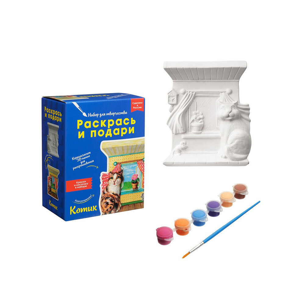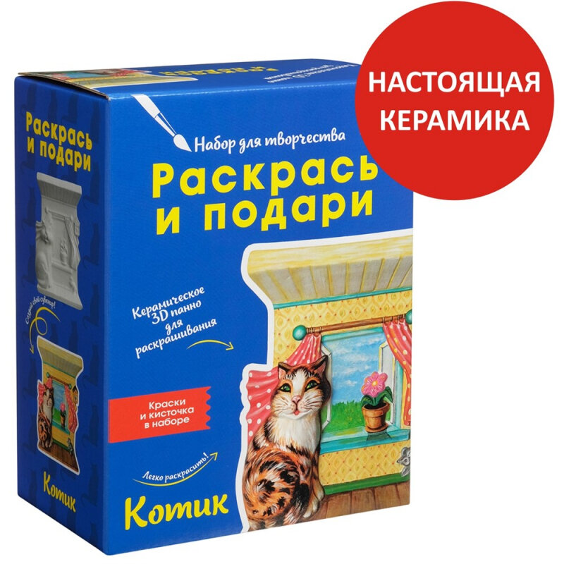 Этот котик оживет под вашей кистью, ведь перед вами настоящее 3D-панно! Этот набор для творчества удивит всех юных художников своей оригинальностью. В наборе есть все, чтобы создать красивую объемную картину: качественная керамическая плакетка, краски и кисточка. Включите воображение и придумайте, как раскрасить панно. Готовая объемная картина будет долгое время радовать вас.