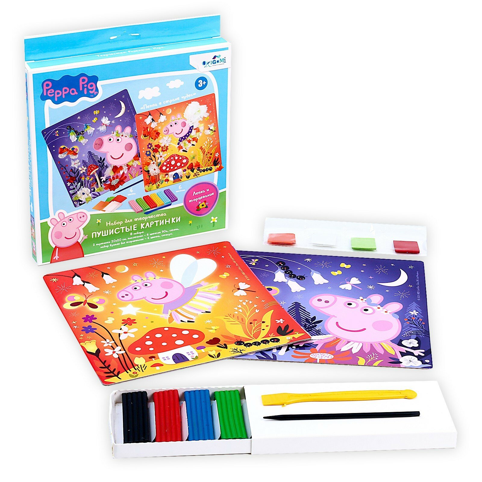 В наборе: 2 картинки (20х20 см.), пластилин (6 цветов), стек, набор бумаги для торцевания (4 цвета), стилус.