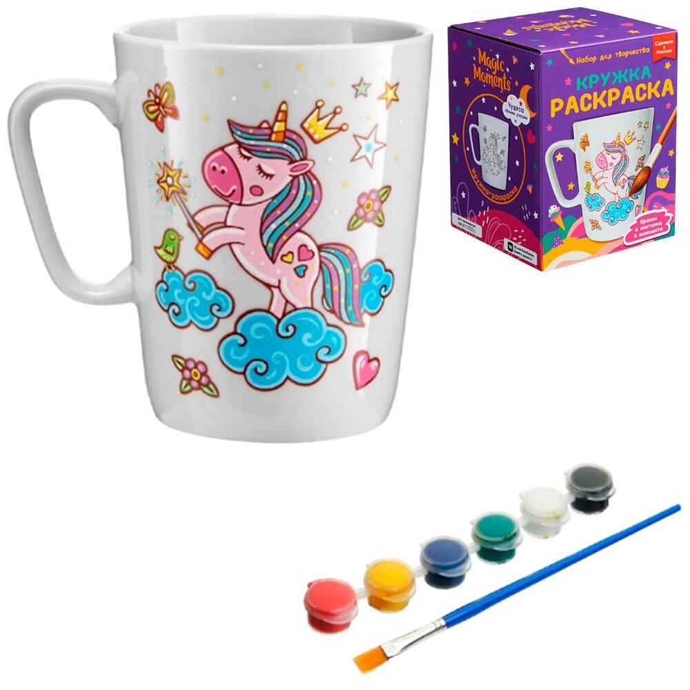 Кружка-раскраска - удивительный набор для творчества, ведь это одновременно и увлекательное занятие и прекрасный сувенир. Кружка, раскрашенная собственными руками, станет достойным подарком близким или займет почетное место в коллекции. Кружка выполнена из качественного фарфора и очень приятная на ощупь. Краски и кисточка входят в комплект. Кружку можно раскрасить краской из набора. При необходимости краску можно смывать и раскрашивать заново. Если вы хотите, чтобы краска закрепилась, ей нужно дать высохнуть в течение 12 часов, а затем поставить кружку в духовой шкаф на 15 минут при температуре 120 градусов. После этого краска закрепится. Мы не рекомендуем мыть кружку в посудомоечной машине или использовать агрессивные моющие средства.