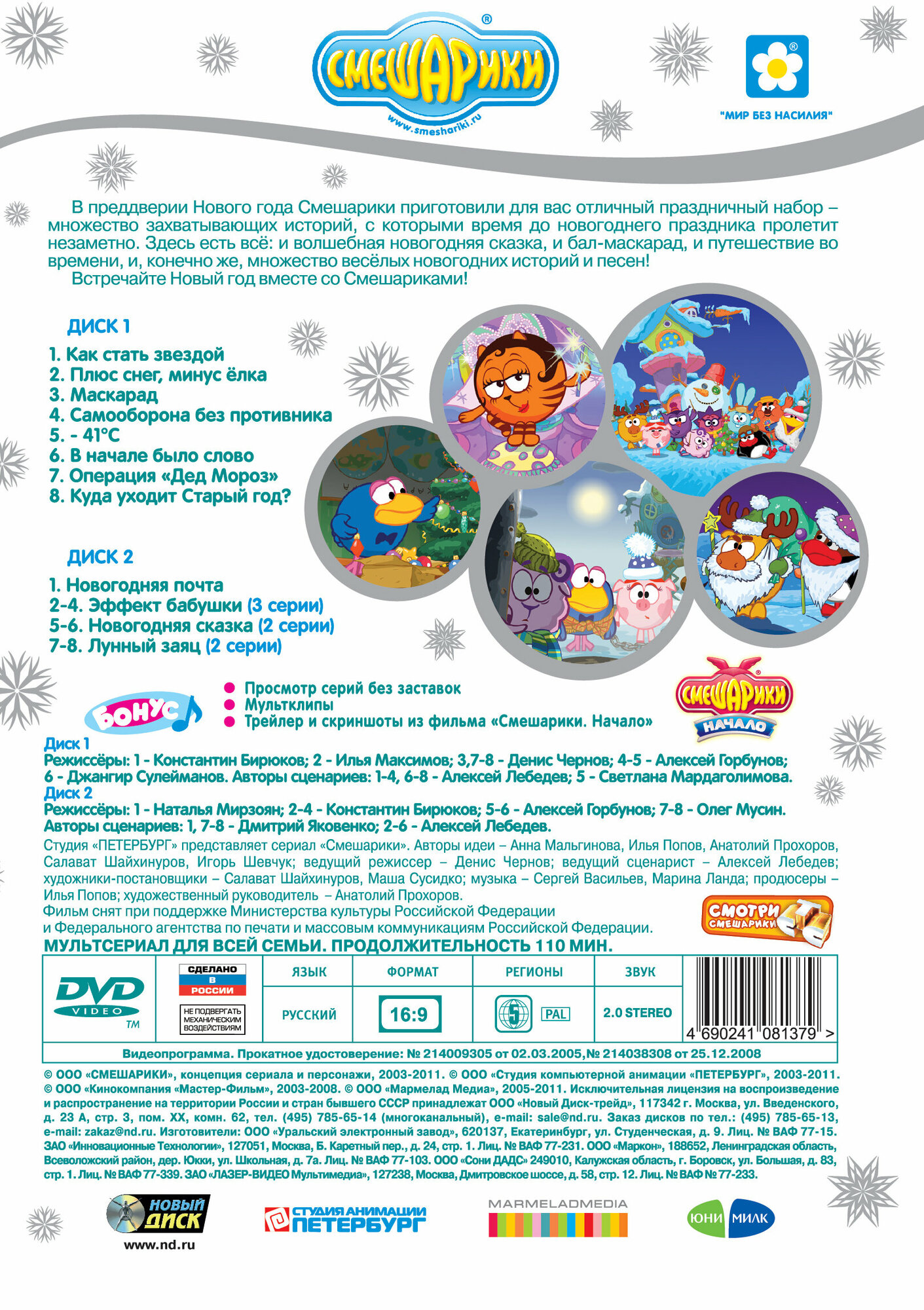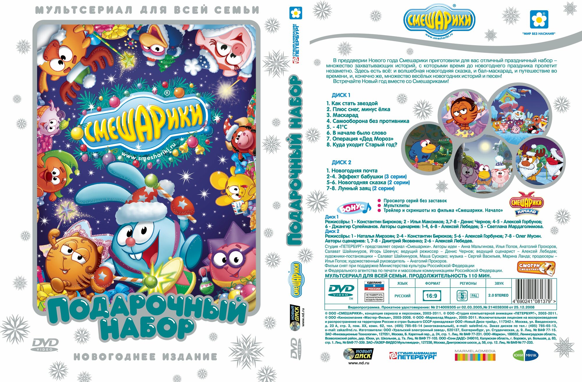 Аннотация: В преддверии Нового года Смешарики приготовили для вас отличный праздничный набор – множество захватывающих историй, с которыми время до новогоднего праздника пролетит незаметно. Здесь есть все: и волшебная новогодняя сказка, и бал-маскарад, и путешествие во времени, и, конечно же, множество веселых новогодних историй и песен!
