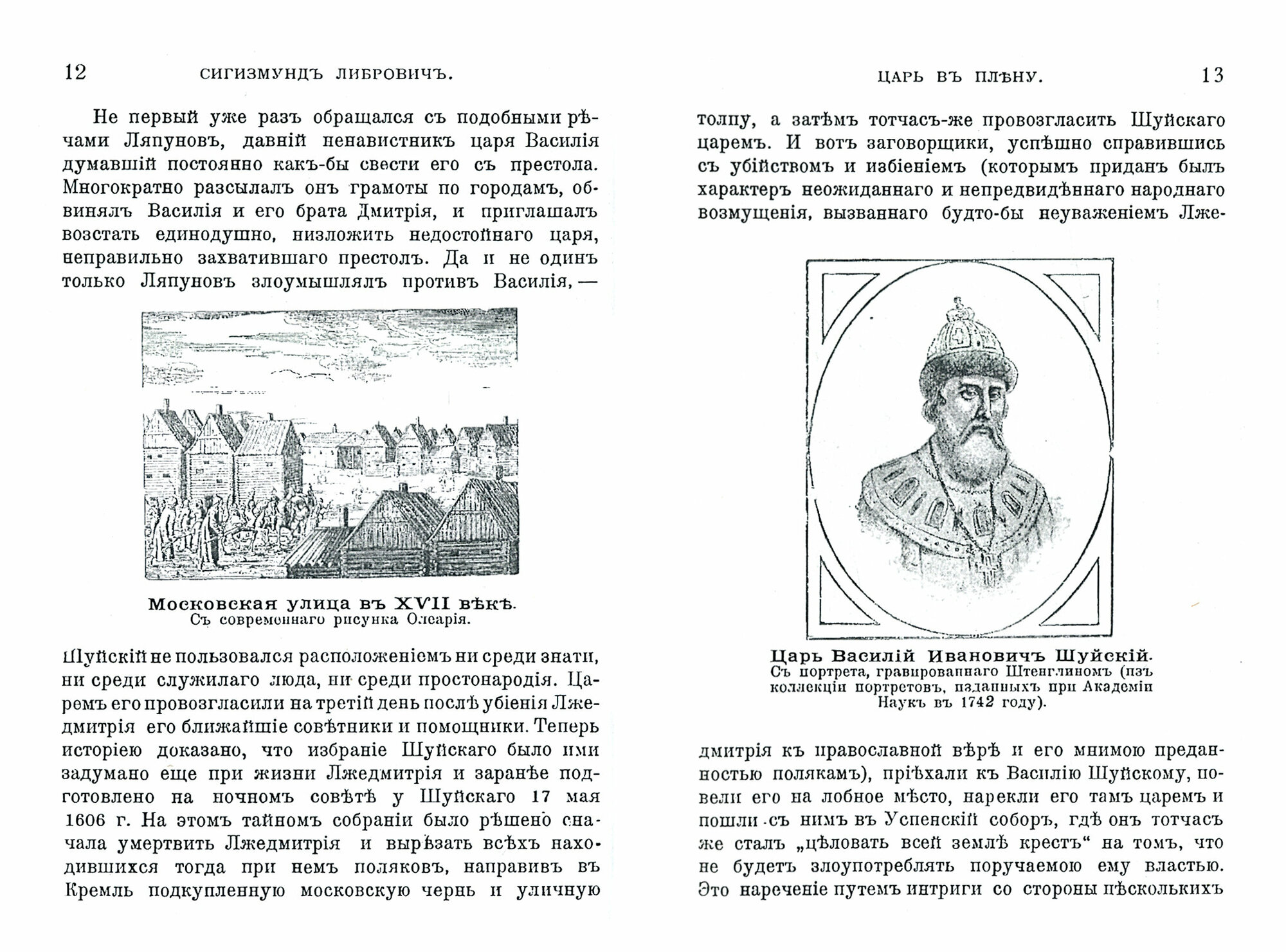 Репринт с издания. СПб., 1904 и 1913. 2 книги в одном переплете. 46+13 иллюстраций в текстах. 17 век в истории России. История царя Василия Ивановича Шуйского (Царь в плену) и польского королевича Владислава Сигизмундовича (Соперник Романова). Сигизмунд Феликсович Либрович (1855 - 1918) - русский писатель польского происхождения, историк, журналист, просветитель. Написал много книг по спорным вопросам русской истории (они переизданы нашем издательством). Более сорока лет проработал в книготорговой и издательской фирме М. О. Вольфа.
