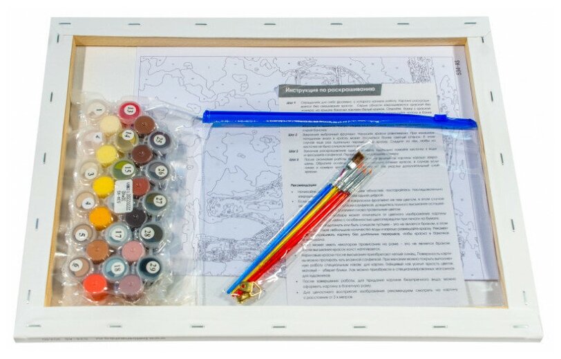 | Комплектация | Холст 100% хлопок на деревянном подрамнике, Набор акриловых красок на водной основе, Кисти с искусственным ворсом - 4 шт. , Крепление для готовой картины, Пакет с zip-застежкой 23х17,5см, Контрольный лист |
