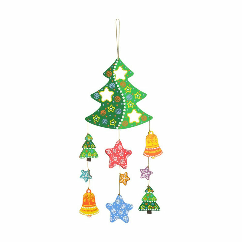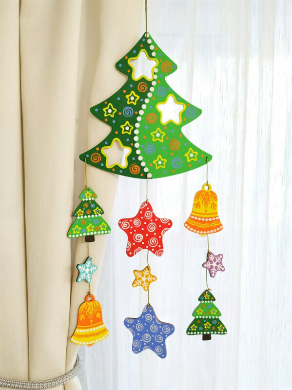 В наборе: деревянные заготовки для раскрашивания (10 шт.), краски и кисть, шнур для сборки подвески.