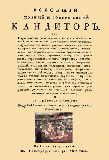 Полное название: Всеобщий полный и совершенный кандитор, или Наука кандиторскаго искуства. для всех состояний, состоящая из 1000 правил, описывающих приуготовления всех родов, сухих и жидких конфектов, мармеладов, массепанов, компотов, консервов, ягодников, бисквитов, кандиторских пен, кремов, тварогов кремовых, мороженых, соков, сыропов, желеев, бланманже, кисей, песков, постил, пирогов, вафлей, сухариков сахарных, тортов, тартелетов, беньетов, пряников, коврижек, пряничных орешков, сахарных лепешечек, и также делание различных горячих и прохладительных питий, как то: чая, кофея, шеколада, лимонадов, медов, шербетов, пуншей и проч. С показанием различных образов украшения, десертных столов всякаго рода свежими плодами и овощами, и с присовокуплением Подробнейшаго словаря всего кандиторскаго искусства.