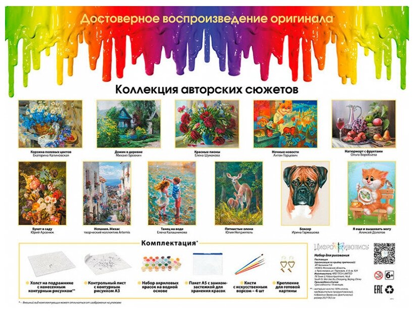 | Комплектация | Холст 100% хлопок на деревянном подрамнике, Набор акриловых красок на водной основе, Кисти с искусственным ворсом - 4 шт. , Крепление для готовой картины, Пакет с zip-застежкой 23х17,5см, Контрольный лист |