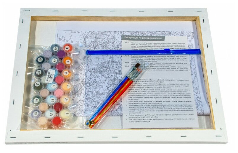 | Комплектация | Холст 100% хлопок на деревянном подрамнике, Набор акриловых красок на водной основе, Кисти с искусственным ворсом - 4 шт. , Крепление для готовой картины, Пакет с zip-застежкой 23х17,5см, Контрольный лист |