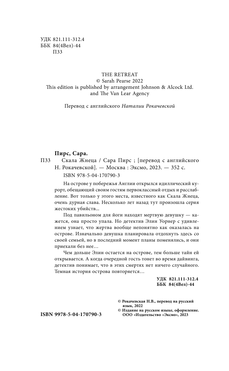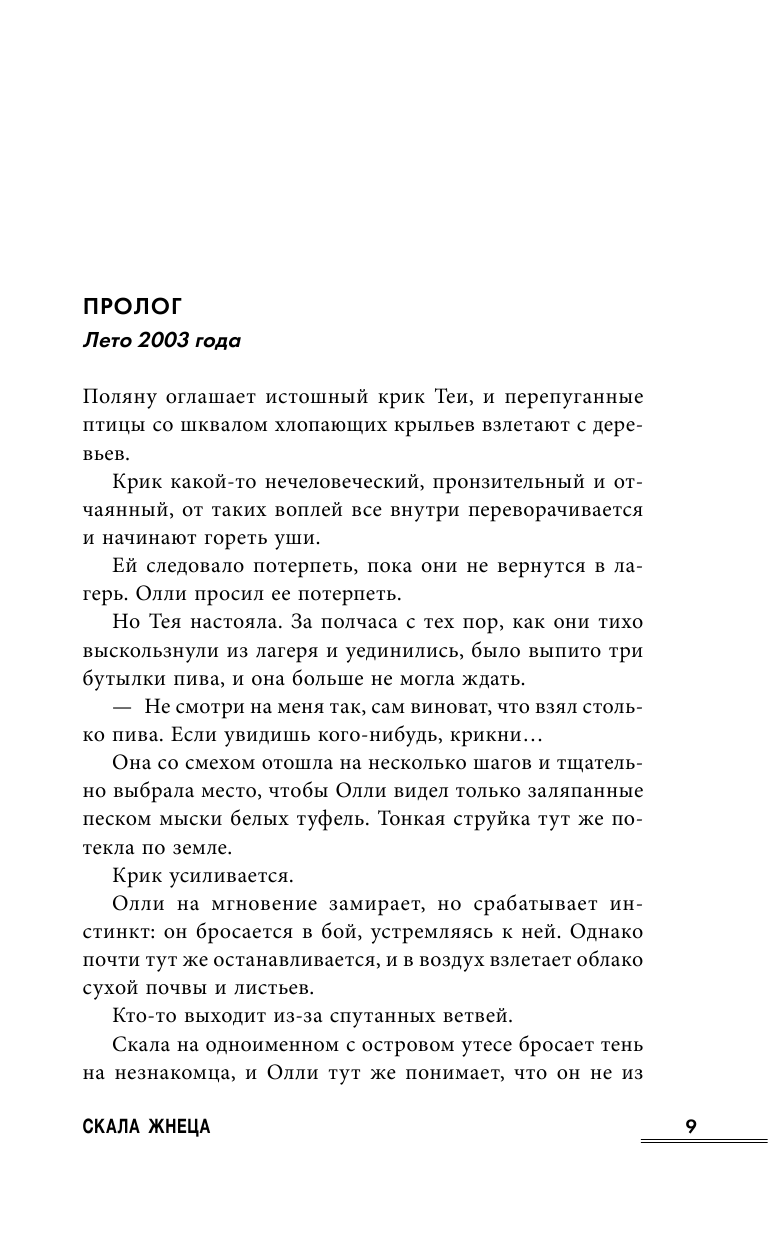 Несколько жутких смертей, идиллический курорт на острове, где произошли убийства в прошлом, множество насилия, суеверий, тема жестокого обращения с детьми и тайна сгоревшей школы — все эти детали делают детективный триллер Сары Пирс «Скала Жнеца» тревожным и напряженным. Быстро погружаешься в атмосферу романа и за считанные секунды оказываешься на том самом курорте, откуда ни сбежать, ни спастись, ведь рядом ходит убийца.