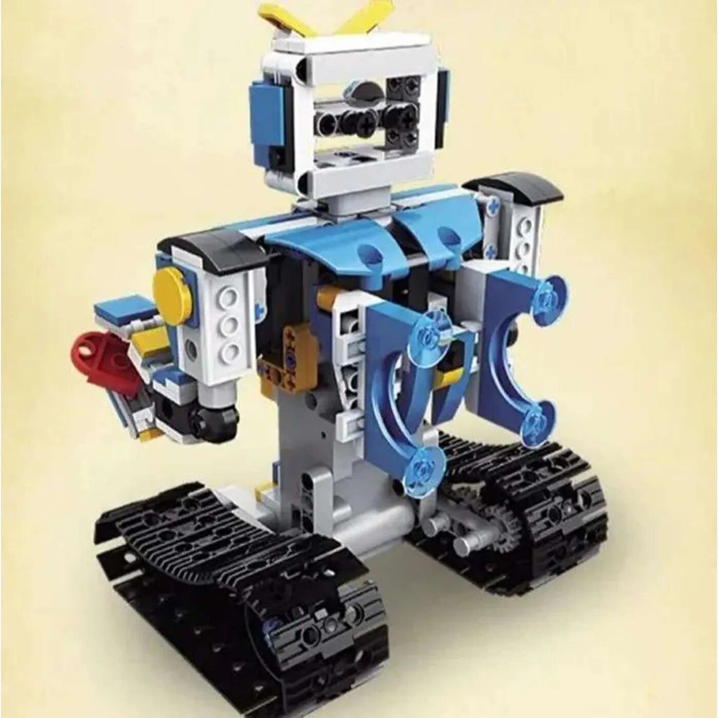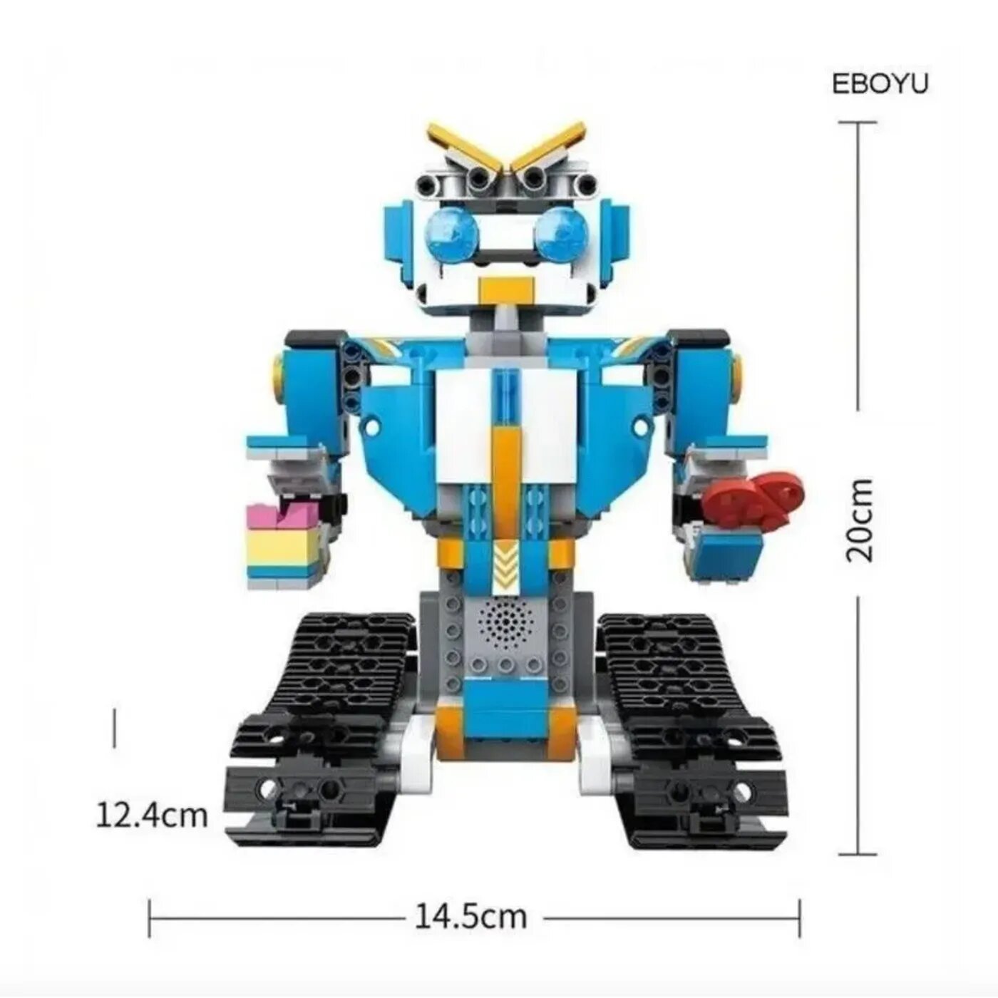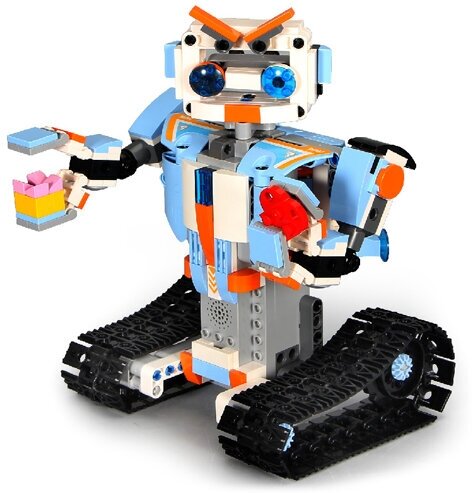 ОписаниеКонструктор радиоуправляемый MOULD KING Робот Воин – новый вид роботизированных моделей. Представленный набором на 351 деталей, он дает возможность конструировать воина и управлять им. Его корпус украшается контрастными вставками белых и голубых тонов. Средством передвижения механического воина служит гусеничная тяга. Треугольная конструкция ног-опор гарантирует плавность и уверенность сделанных «шагов». Голова модели имеет сложную, нестандартную форму. Она состоит из глаз, треугольной пластины (имеет некоторое сходство с носом) и других составных элементов. По бокам от шеи располагаются широкие наплечники. Они находят продолжение в руках-манипуляторах. Каждая из них заканчивается пушкой, одновременно пускающей в ход шесть зарядов. Торс робота состоит из пластин обтекаемой формы. С каждой стороны его обрамляют множество крепящих элементов. Г-образные детали бело-синего цвета создают некое подобие коленей. На поясе механического воина размещается круглая эмблема с восьмиугольником посредине, выполненная в традиционном сочетании белых, синих и темно-синих цветов.Особенности модели:Модуль основного управляющего воздействия: IBB 3.2 high speedОбъем аккумулятора: 3.7 V, 400 mAh.Мотор: Повышенной мощности.Пульт управления: Bluetooth + 2.4G.Зарядка: 120 минут.Время игры: 40 минут.Дальность действия пульта управления: до 20 м.Необходимо докупить: 2 батареи АААКомплектация: электрический привод, пульт дистанционного управления, USB-кабель для зарядки, инструкция для сборки, сборочные детали.