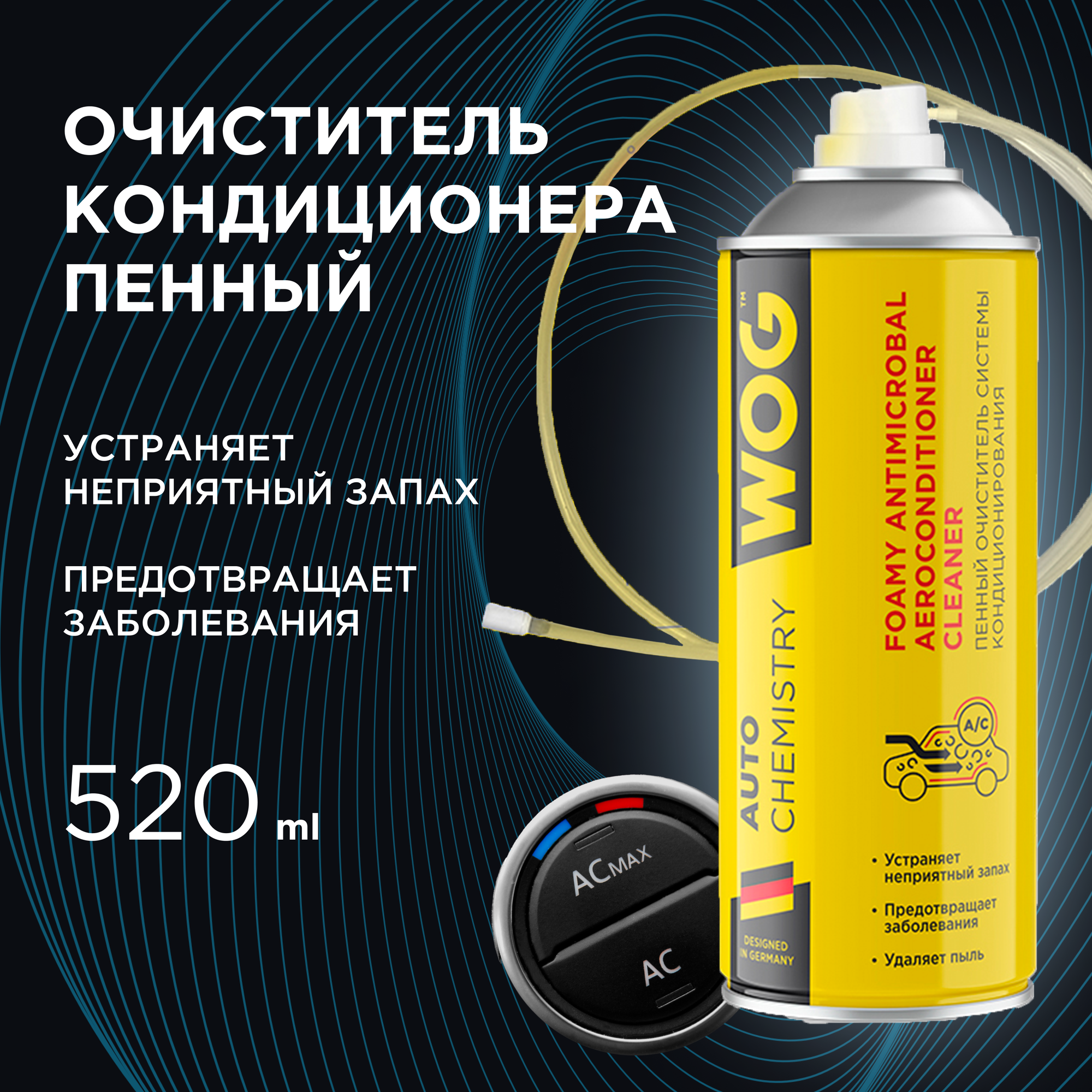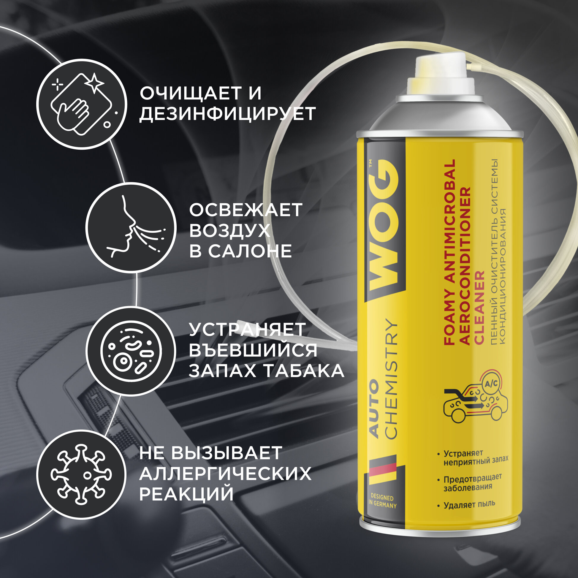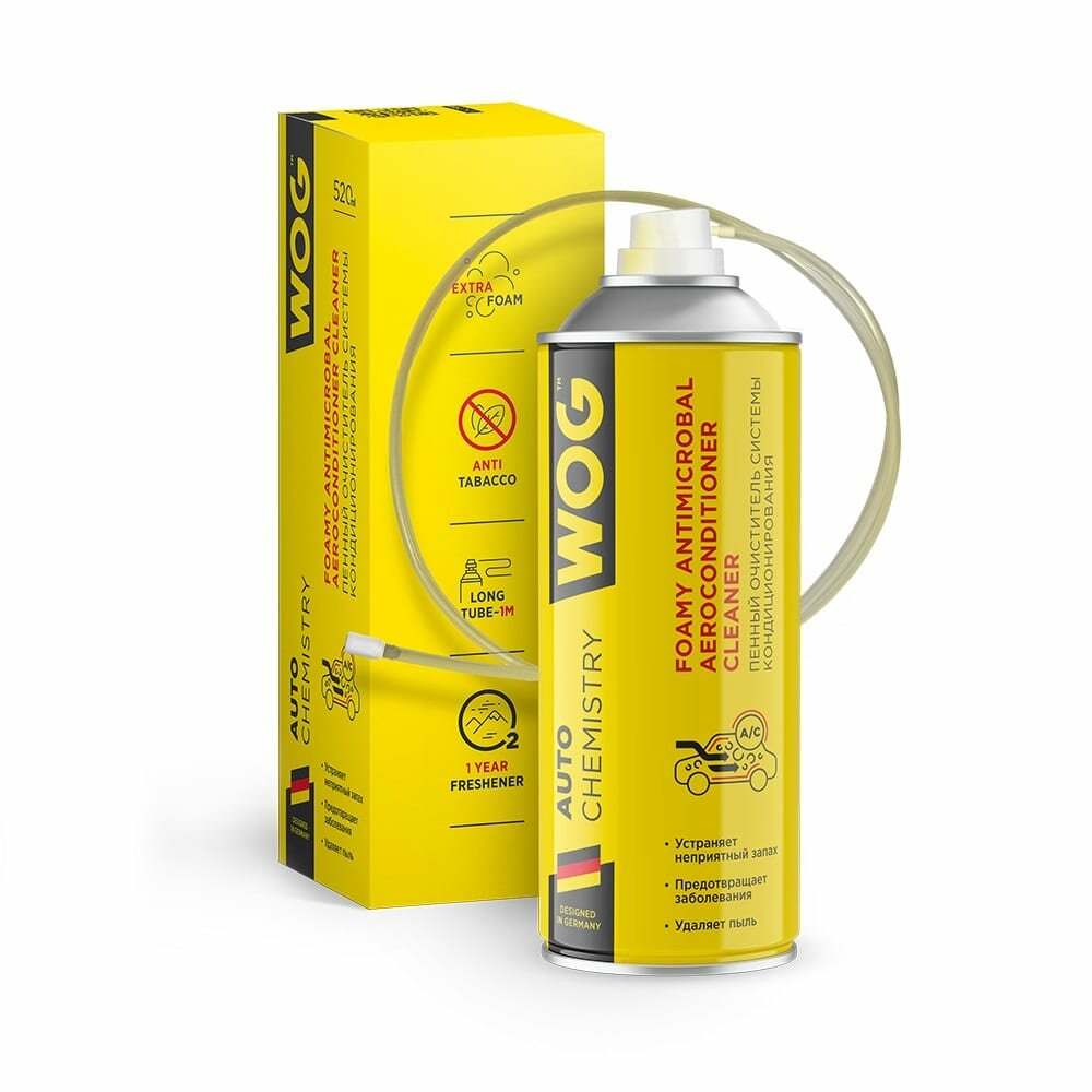Очиститель кондиционера пенный автомобиля, бытового кондицонера (антибактериальный, гипоаллергенный) WOG WGC0801, 520 мл. Очиститель кондиционера автомобиля - профессиональный продукт, очищает, дезинфицирует и предотвращает повторное появление микробов и болезнетворных бактерий в системе кондиционирования. Освежает воздух в салоне и устраняет неприятный въевшийся запах табака. Не вызывает аллергических реакций и абсолютно безопасен. Использовать при температуре не ниже +5С. Способ применерия: 1) Снимите салонный фильтр 2) Отсоедините дренажную трубку системы кондиционирования и введите в нее зонд-удлинитель до упора 3) Полностью распылите препарат в систему 4) Подсоедините дренажную трубку на штатное место 5) Подождите 10 минут 6) Откройте окна, запустите двигатель 7) Включите кондиционер на полную мощность, активируйте систему рециркуляции воздуха салона 8) По прошествии 15 минут заглушите двигатель и проветрите салон еще в течение 10 минут. Рекомендуется проводить очистку кондиционера не реже 1 раза в год.