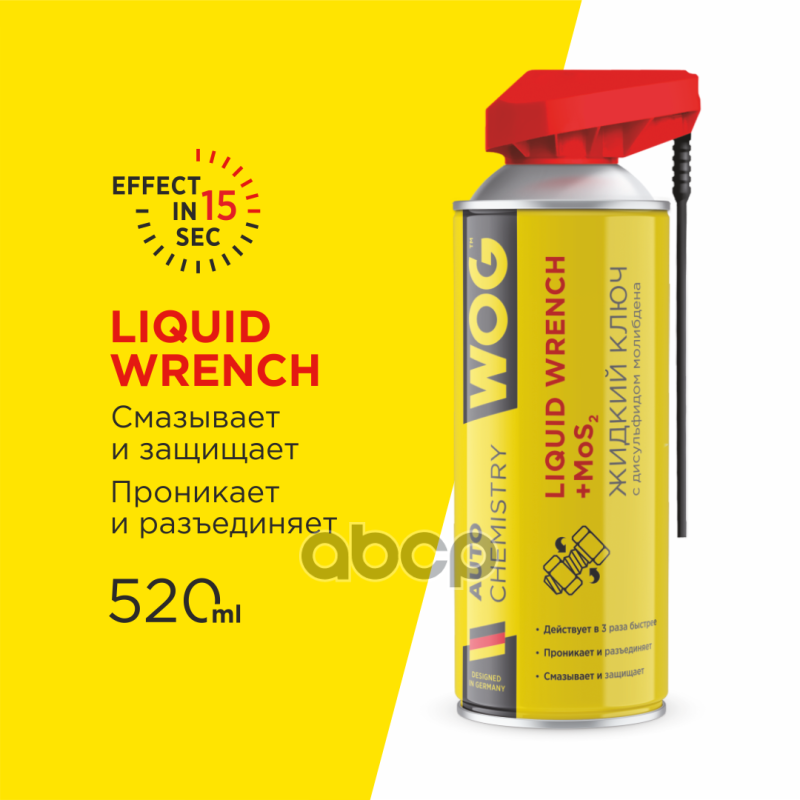 Жидкий ключ с дисульфидом молибдена (WD40) с профессиональным распылителем 2 в 1 WOG, 520 мл - профессиональный продуктобладает высокой проникающей способностью,гарантирует отвинчивание приржавевших, пригоревших и прикипевших автомобильных крепежей,обеспечивает долговременный эффект, значительно снижая трение при повторном использовании обработанных деталей,вытесняет влагу и обладает антикоррозийным действием.Способ применения:Использовать при температуре не ниже +5С.Тщательно встряхнуть баллон.Обработать поверхности, повторить процедуру при необходимости.Для доступа в труднодоступные места поднять носик распылителя и использовать сифонную трубку.Состав: Алифатические углеводороды >30%, минеральное масло