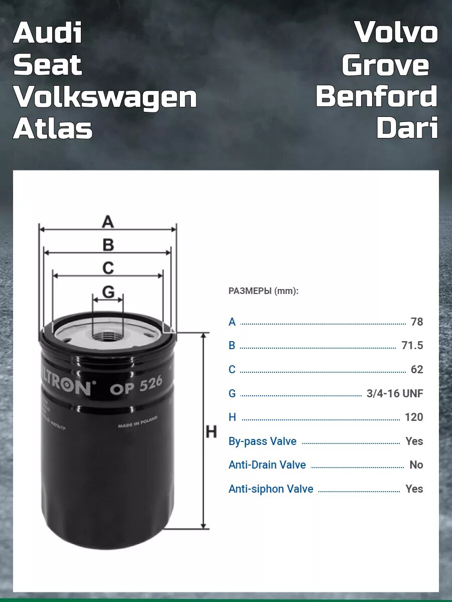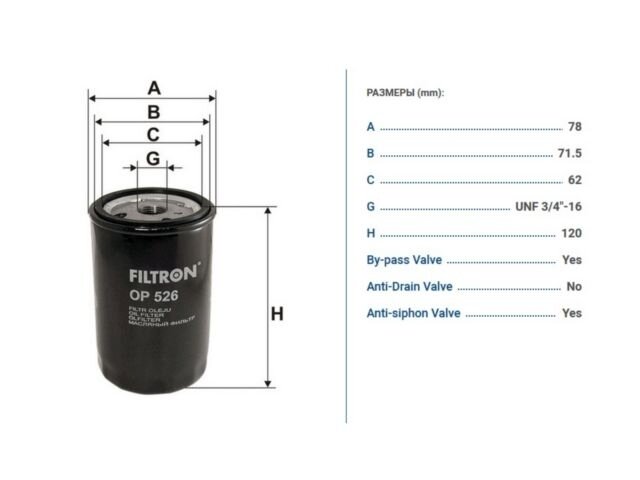 Фильтр масляный FILTRON OP 526 для Audi 80/100/A6/A4,VW Golf/Vento/Passat/T4 1.0-2.3 80> изготовлен из материалов высокого качество, которое контролируется лабораторными исследованиями. Фильтрующие среды, а также клапаны, пружины, корпуса или другие элементы фильтров соответствуют требованиям, предъявляемым им даже в самых тяжелых условиях эксплуатации.Проверенная герметичностьВ процессе производства специалисты проводят многочисленные испытания на герметичность масляных фильтров, обладающих корпусом. Испытания проводятся с использованием современных и автоматизированных измерительных машин. Покупая масляный фильтр FILTRON, вы можете быть уверены в том, что его конструкция исключает риск утечки масла.Прецизионные клапаны, учитывающие все требованияB масляных фильтрах корпусного типа с клапанами важно, чтобы конструкция и свойства клапанов соответствовали требованиям изготовителя двигателя или транспортного средства. Клапаны в масляных фильтрах FILTRON разработаны с учетом индивидуальных требований так, чтобы фильтр всегда надёжно выполнял свою задачу в масляной системе.Использование современных синтетических материаловЗамена металлических элементов масляного фильтра элементами, изготовленными из синтетических материалов – это широко применяемая тенденция в фильтрационной отрасли, вызванная желанием облегчить утилизацию фильтра и уменьшить его массу. Стоит отметить, что используемые синтетические материалы тщательно тестируются в лаборатории, поэтому их качество всегда соответствует предъявляемым к ним требованиям.
