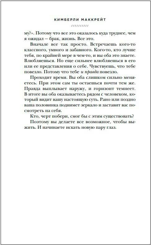 "Персонажи Кимберли Маккрейт имеют внешне идеальную жизнь, однако их величайшее мастерство - сокрытие за блестящими фасадами адюльтеров, запрещенных веществ и личного и финансового краха…" - New York Times Book Review