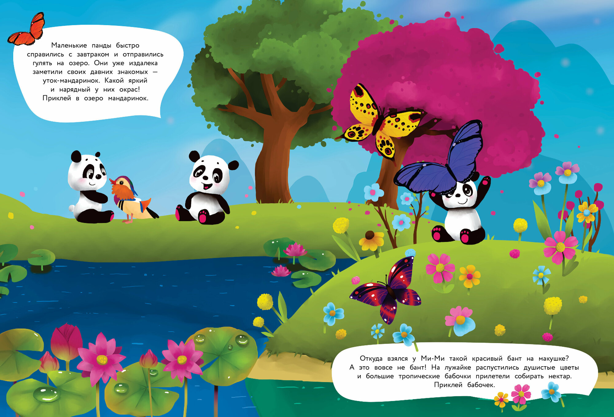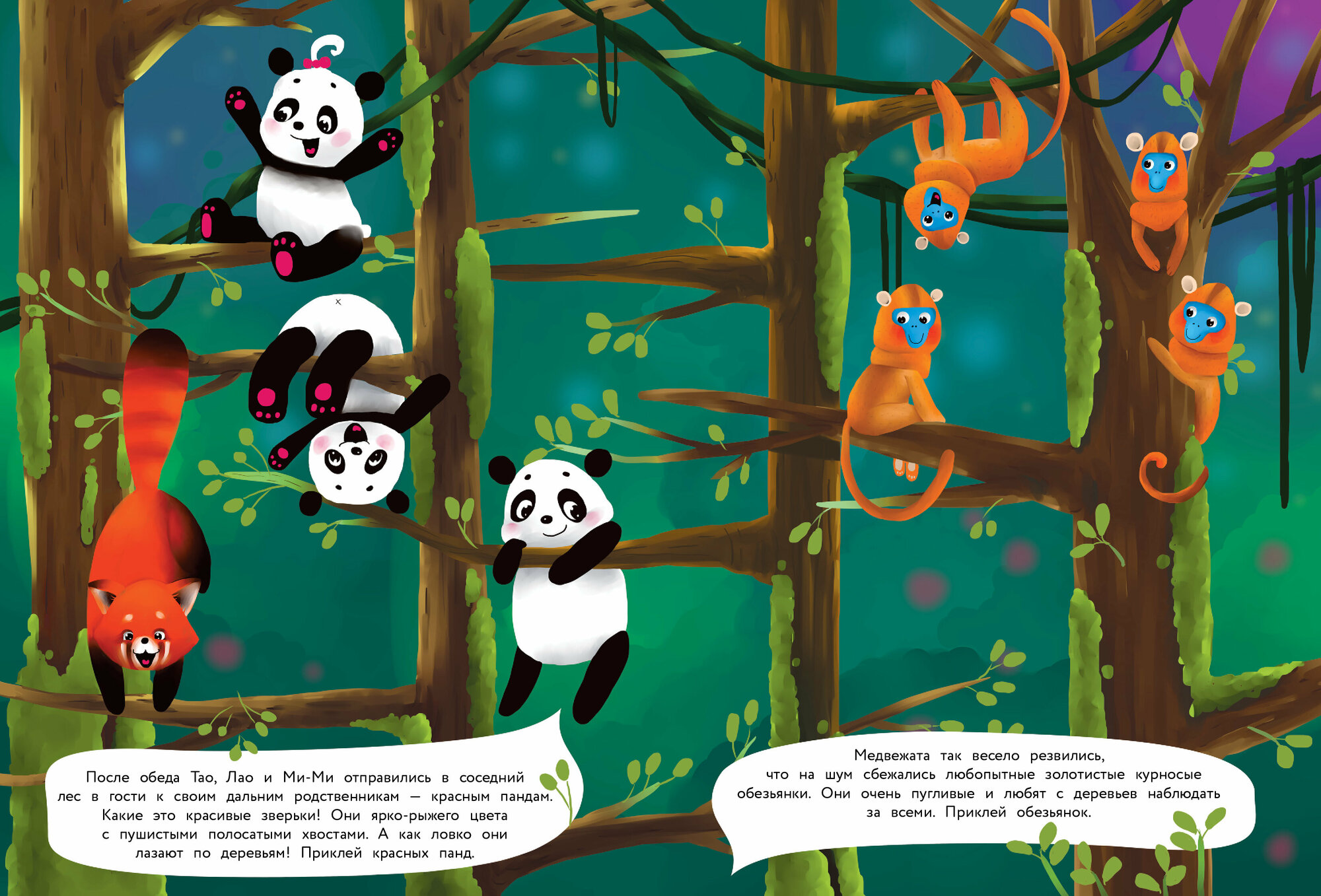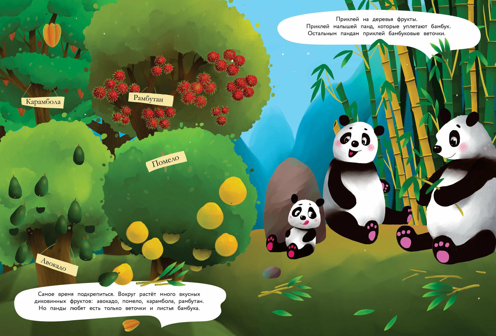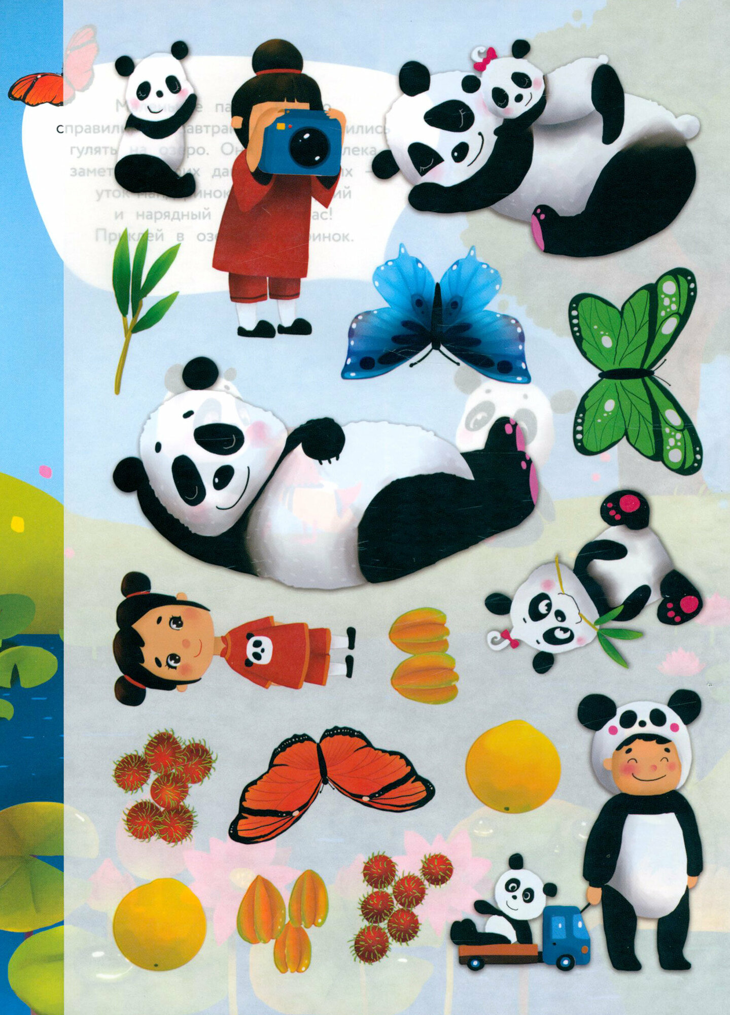 Давай отправимся в путешествие в далёкий Китай и познакомимся с семейством удивительно милых и красивых панд. А заодно узнаем, какие ещё удивительные животные там живут и какие растут экзотические фрукты. С нашими наклейками будет очень интересно, ведь они многоразовые! Можно придумывать свои истории и приклеивать их снова и снова.