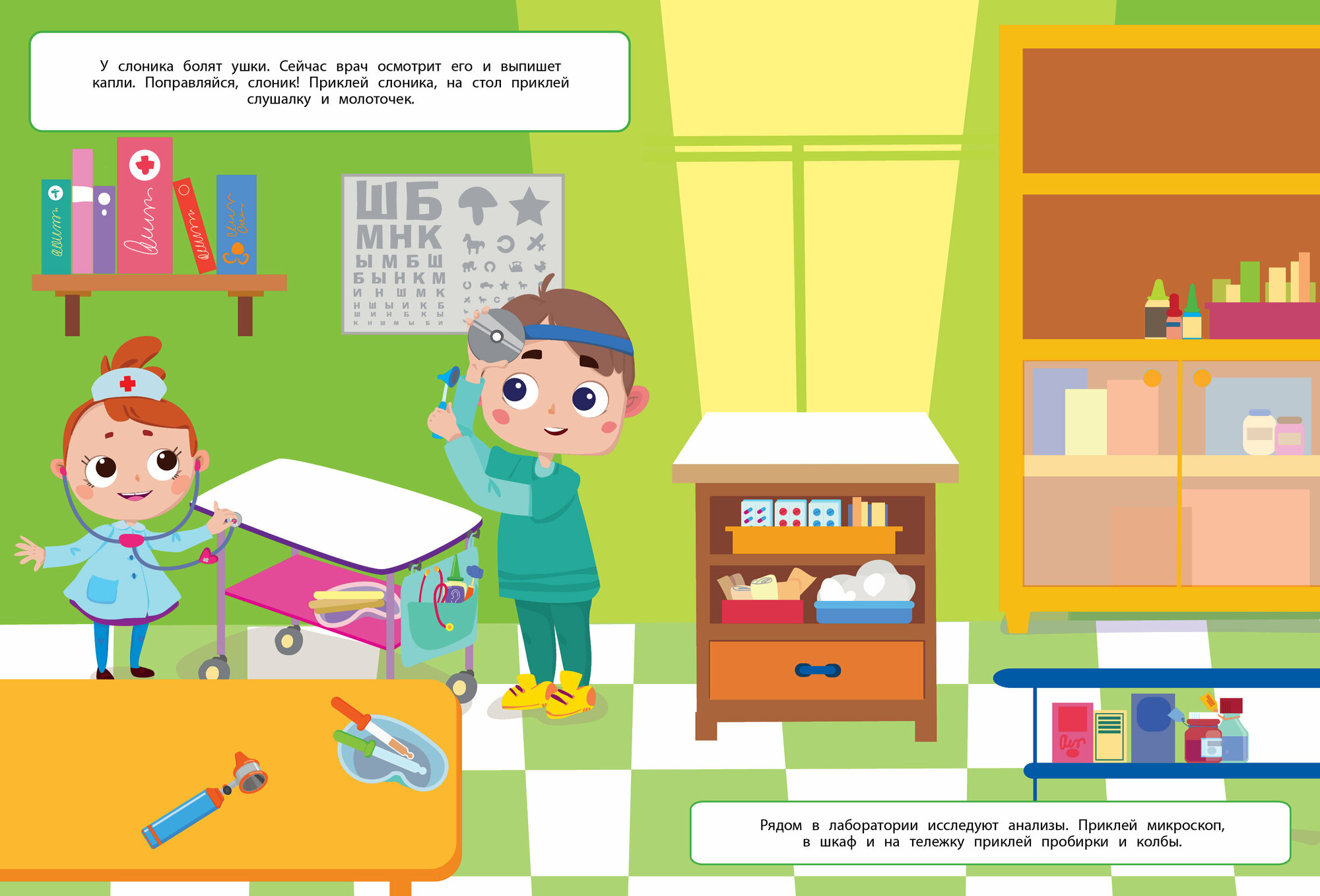 С этой книжкой ваш малыш сможет стать самым настоящим врачом! Игрушки уже выстроились в очередь. Им нужно сделать прививку, наложить гипс, проверить ушки, исследовать анализы, выписать рецепт. Приклеивайте картинки и придумывайте свои истории с игрушками. Наклейки в книжке многоразовые, поэтому можно приклеивать их снова и снова! А самое главное - не бойтесь врачей и не болейте!