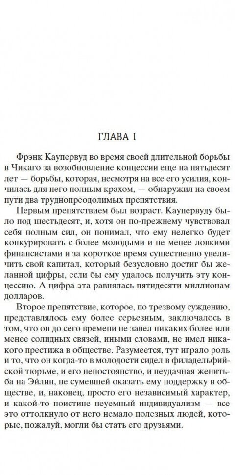 Теодор Драйзер писал об одной и сторон человеческой жизни без прикрас, не щадя читателя. В книжке представлена третья, завершающая часть трилогии желания Теодора Драйзера. Интересно, конечно, было чем закончится эта история. У многих главный герой истории вызывает противоречивые чувства. Но тем не менее главный герой в книге представлен как успешный бизнесмен, и , возможно, благодаря своим человеческим качествам он был успешным.