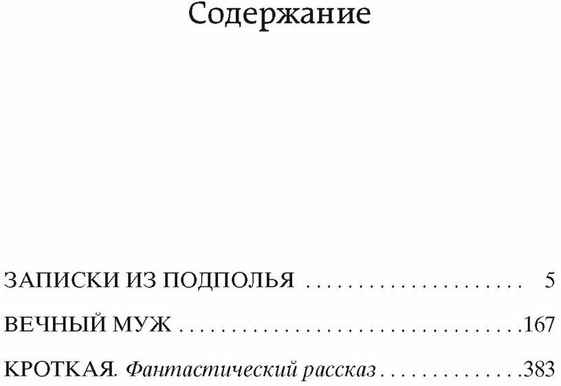 В настоящее издание вошли три повести Ф. М. Достоевского: «Записки из подполья», «Вечный муж» и «Кроткая». «Записки из подполья» — увертюра Достоевского к его пятикнижию, повесть точно поставленных вопросов и точно найденных интонаций. Боль пронизывает слово героя, одинокого, безымянного рассказчика, который ведет дневник, рассказывая о своей печальной жизни. Повести «Вечный муж» и «Кроткая» — своего рода психологические этюды, размышления писателя на тему любви и семейной жизни. Любовные драмы в обеих повестях становятся лишь основой для развития действия, в то время как внимание автора сосредоточено на исследовании двух человеческих типов — тирана и жертвы.