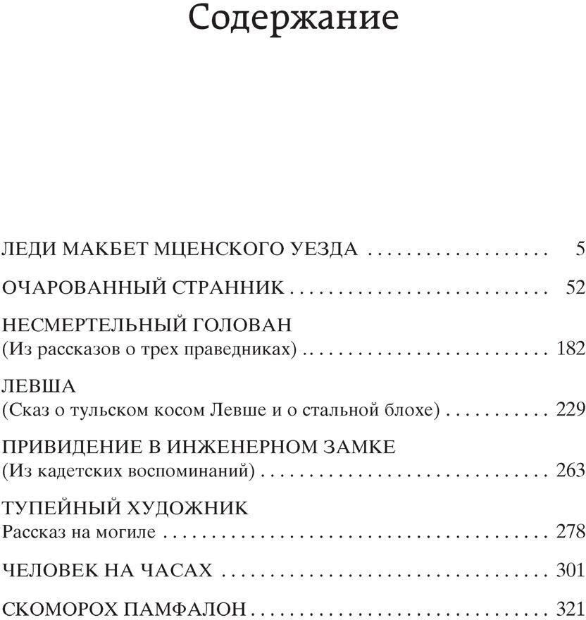 «Он прекрасно чувствовал то неуловимое, что называется «душой народа», — сказал М. Горький об авторе знаменитых «Левши», «Очарованного странника», «Леди Макбет Мценского уезда». Самобытный талант Лескова заставляет задуматься о загадочной русской душе, о парадоксах и противоречиях национального характера. Напряженные духовные искания писателя, интерес к разным сторонам жизни, глубинное знание быта, бесконечное разнообразие сюжетов и ситуаций — все эти черты творчества Лескова нашли отражение в самых известных его произведениях, включенных в настоящий сборник.