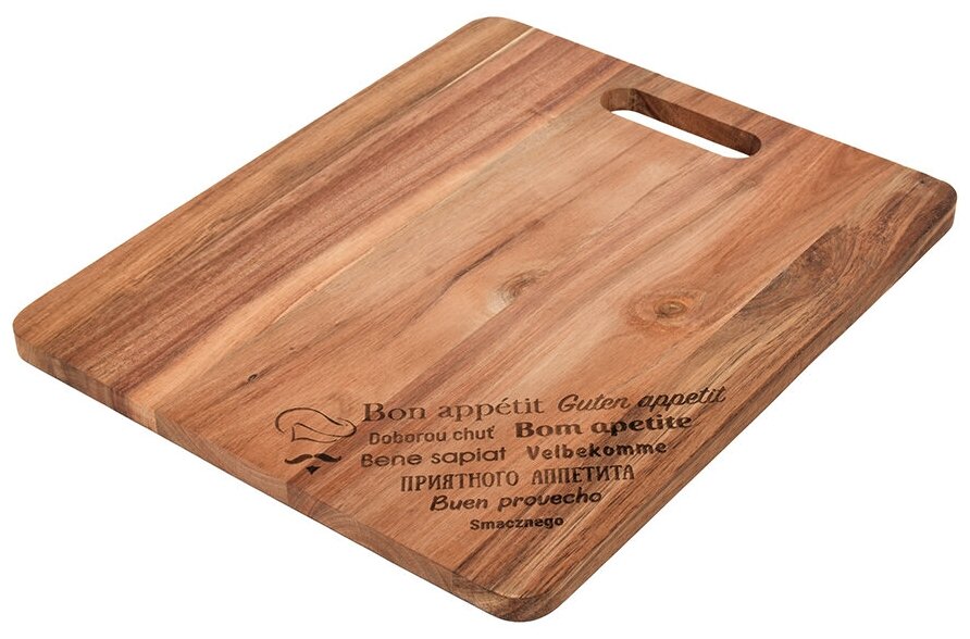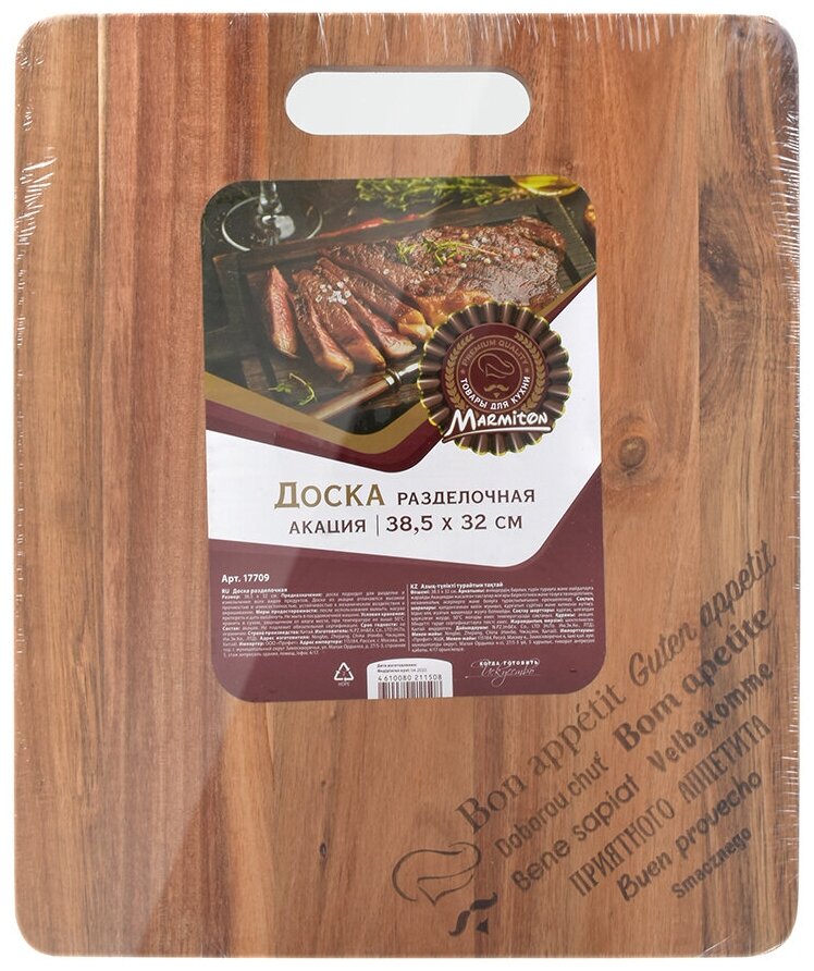 Доска подходит для разделки и измельчения всех видов продуктов.Размер 38,5*32*1,5 см.Состав: акация.Условия хранения: Хранить в сухом, защищенном от влаги месте.Рекомендации по уходу: после использования вымыть, насухо протереть и дать высохнуть. Не мыть в посудомоечной машине.