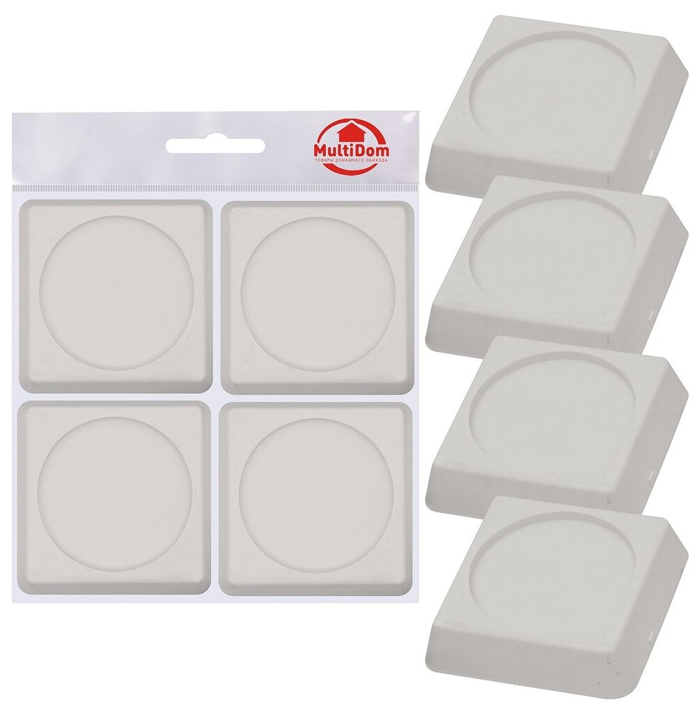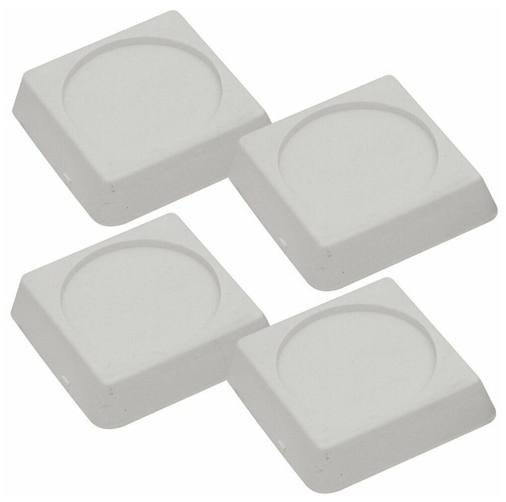 Применение подставок позволяет значительно снизить нагрузку ножек техники на напольное покрытие, керамическую плитку, деревянные полы, а также предотвращает скольжение стиральной машины при работе в режиме отжима. Снижение вибрации при работе техники достигается оптимальной формой подставок и использованием высокопрочного материала.