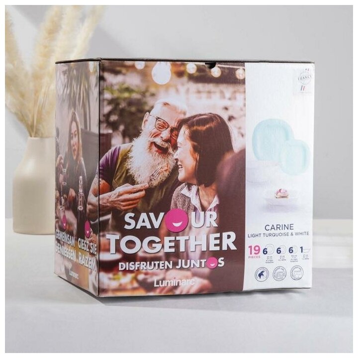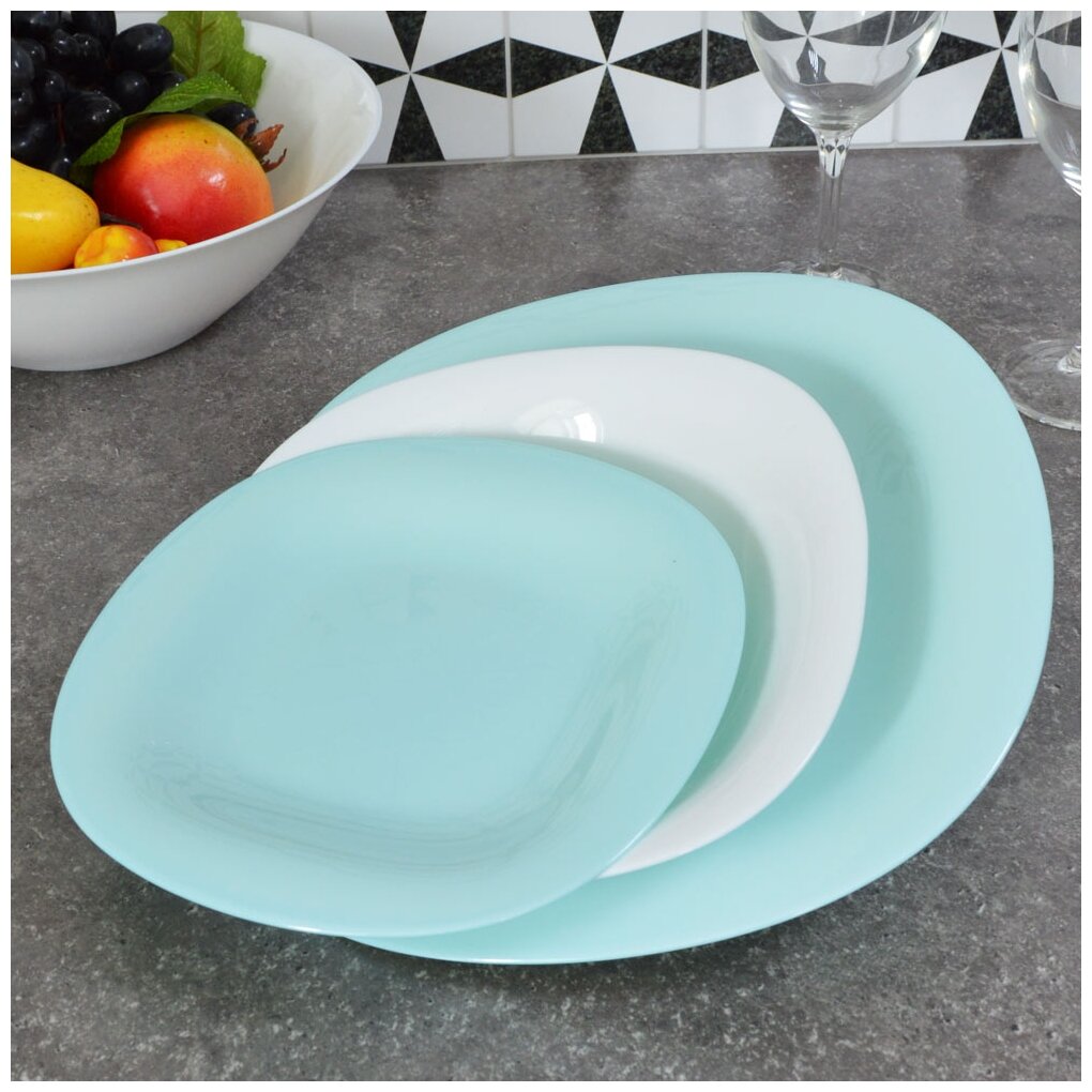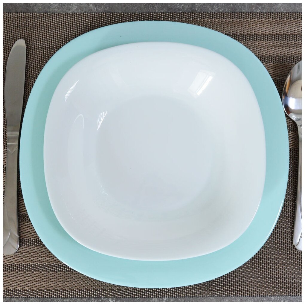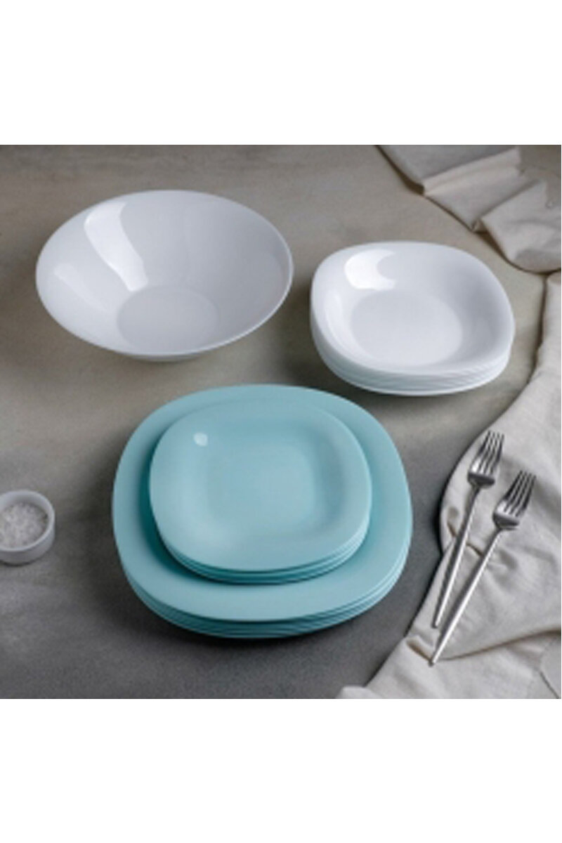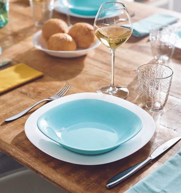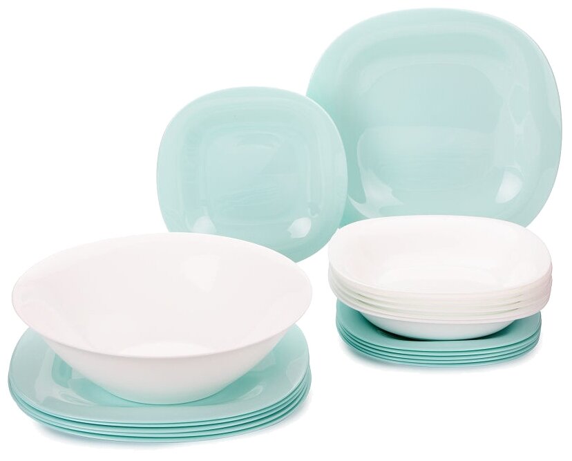 Столовый сервиз LUMINARC КАРИН ЛАЙТ ТЮРКУАЗ бело-голубой выполнен из высококачественного ударопрочного стекла. Можно использовать в СВЧ и мыть в посудомоечных машинах. Сервиз рассчитан на 6 персон и включает 19 предметов: салатник большой 27 см (белый) - 1 шт, тарелка обеденная 27 см (бирюзовая) - 6 шт, тарелка глубокая 21 см (белая) - 6 шт, тарелка десертная 19 см (бирюзовая) - 6 шт.