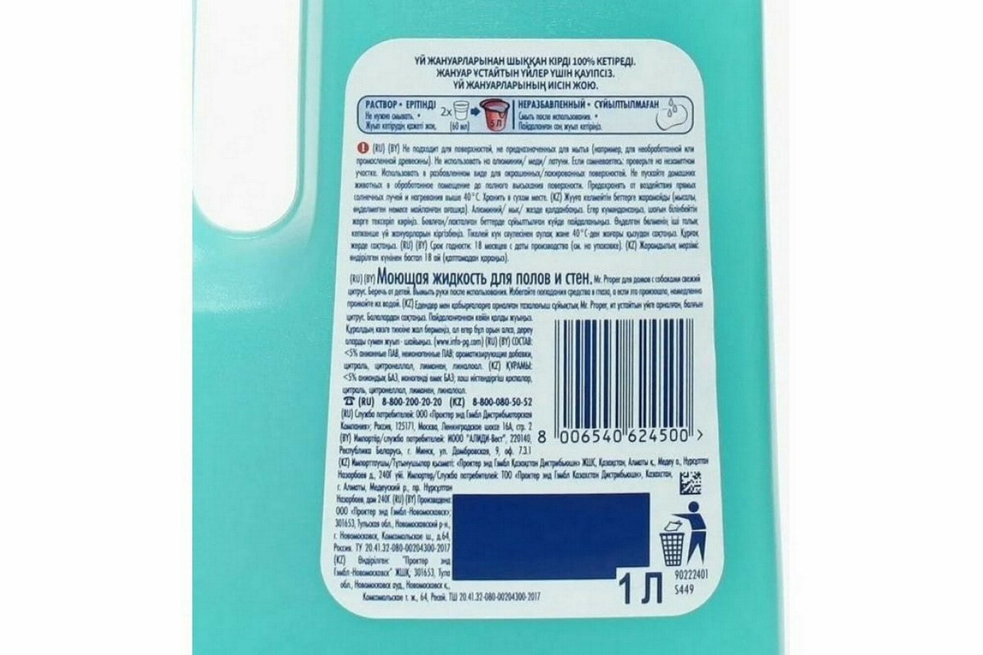 Моющая жидкость для полов и стен Mr. Proper для домов с питомцами удаляет до 100% грязи и запаха от питомцев! Формула жидкости основана на технологии захвата и устранения даже самых стойких ароматов. Мощная чистящая формула удаляет до 100% грязи от домашних животных, например, засохшую еду вокруг миски, грязь около подстилки любимого питомца или брызги вокруг лотка. Оставляет сияющие поверхности и наполняет Ваш дом приятным цитрусовым ароматом. Подходит для использования на большинстве поверхностях в доме. Не использовать на промасленной и необработанной древесине. Не использовать на домашних животных. Не содержит хлора. Способ применения: добавить два колпачка в ведро с теплой водой.