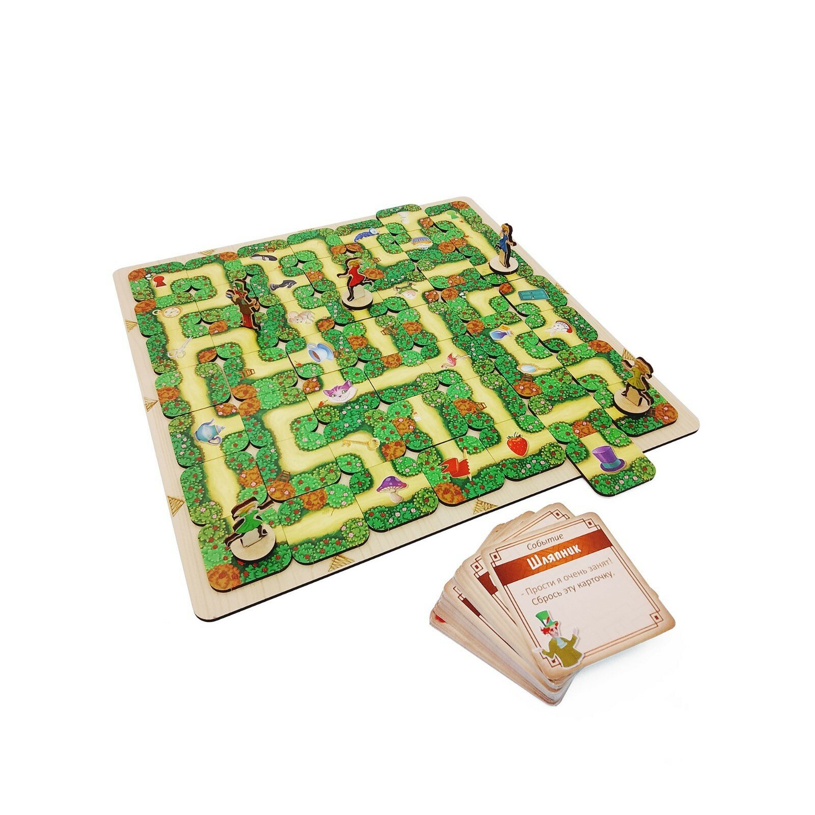 Червонная королева приказала сумасшедшему Шляпнику явиться во дворец. Но он заблудился в лабиринте. Алиса отправляется на его поиски в загадочный лабиринт, выращенный по приказу королевы. Вот только лабиринт не так прост. Стены постоянно двигаются, а дороги убегают прямо из под ног. Один раз пройти по одному и тому же пути просто невозможно. Особенности игры заключается в наличии деревянного поля, складывающегося в виде пазла, а так же двух уровней сложности: базового и продвинутого. Приятные на ощуп тайлы с качественной полиграфией не оставят никого равнодушными.