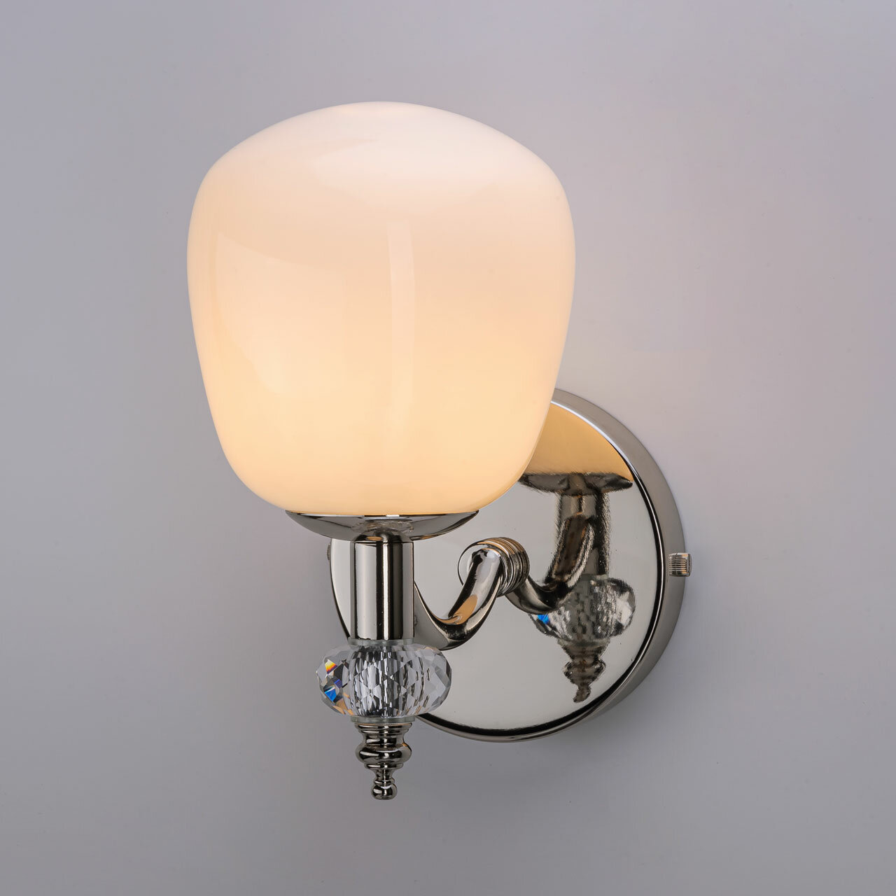 Металлическое основание бра гальванизировано в цвет хрома. Стеклянный плафон вытянутой формы окрашен в белый цвет изнутри. Настенное бра декорировано прозрачным массивом хрусталя.