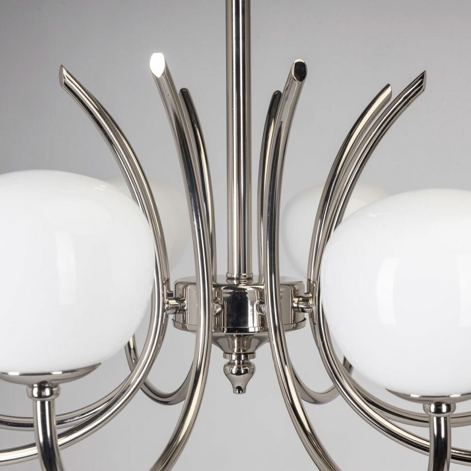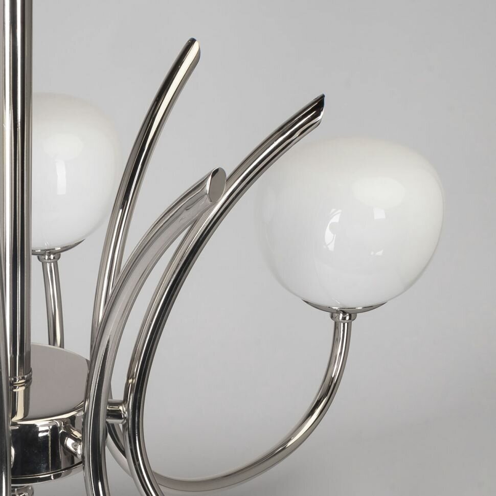 Металлическое основание светильника гальванизировано в цвет хрома. Стеклянные плафоны вытянутой формы окрашены в белый цвет изнутри. Люстра декорирована прозрачными массивами хрусталя.