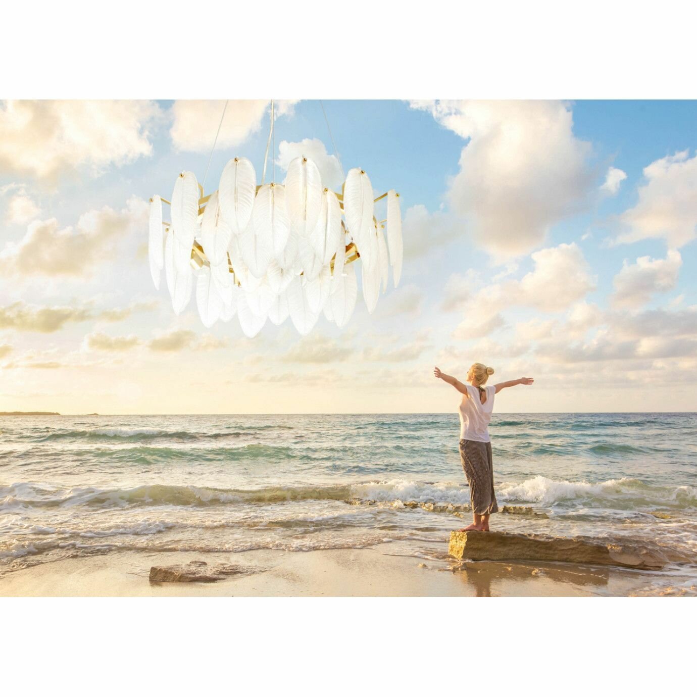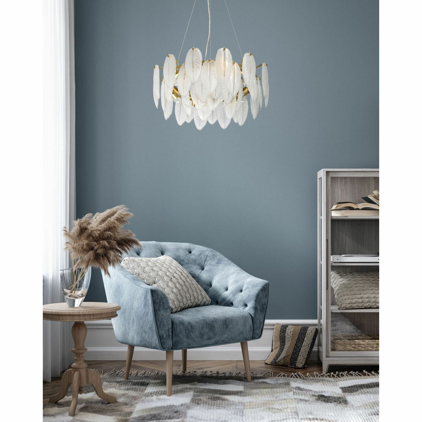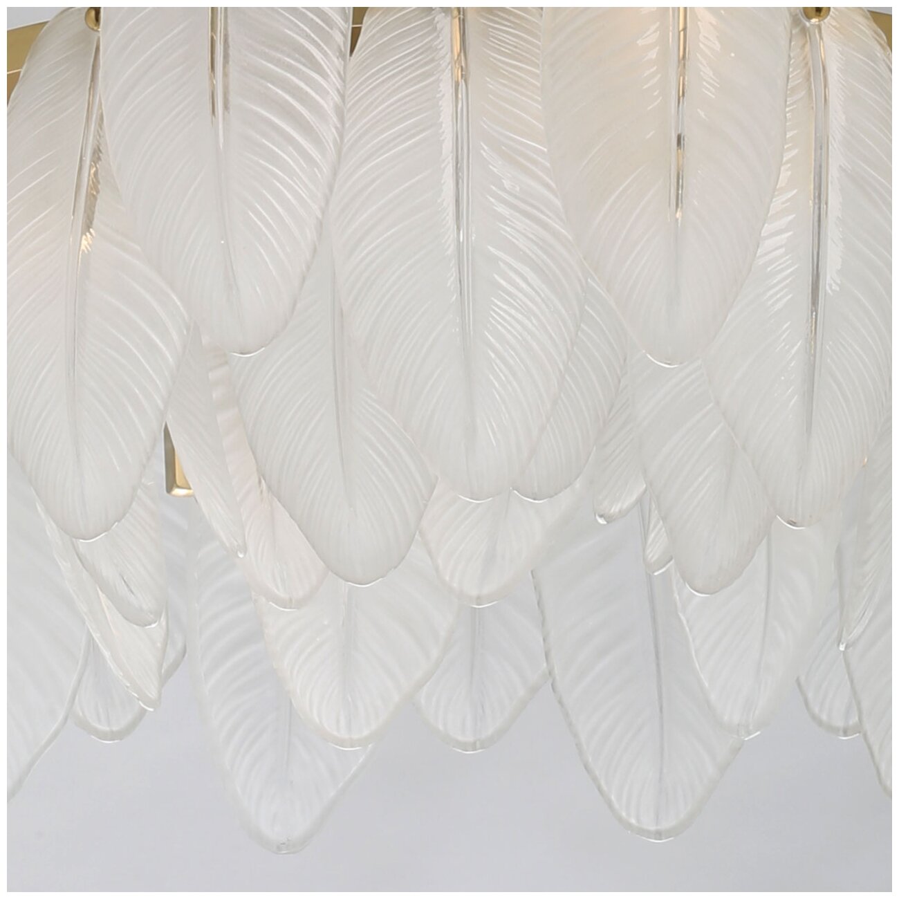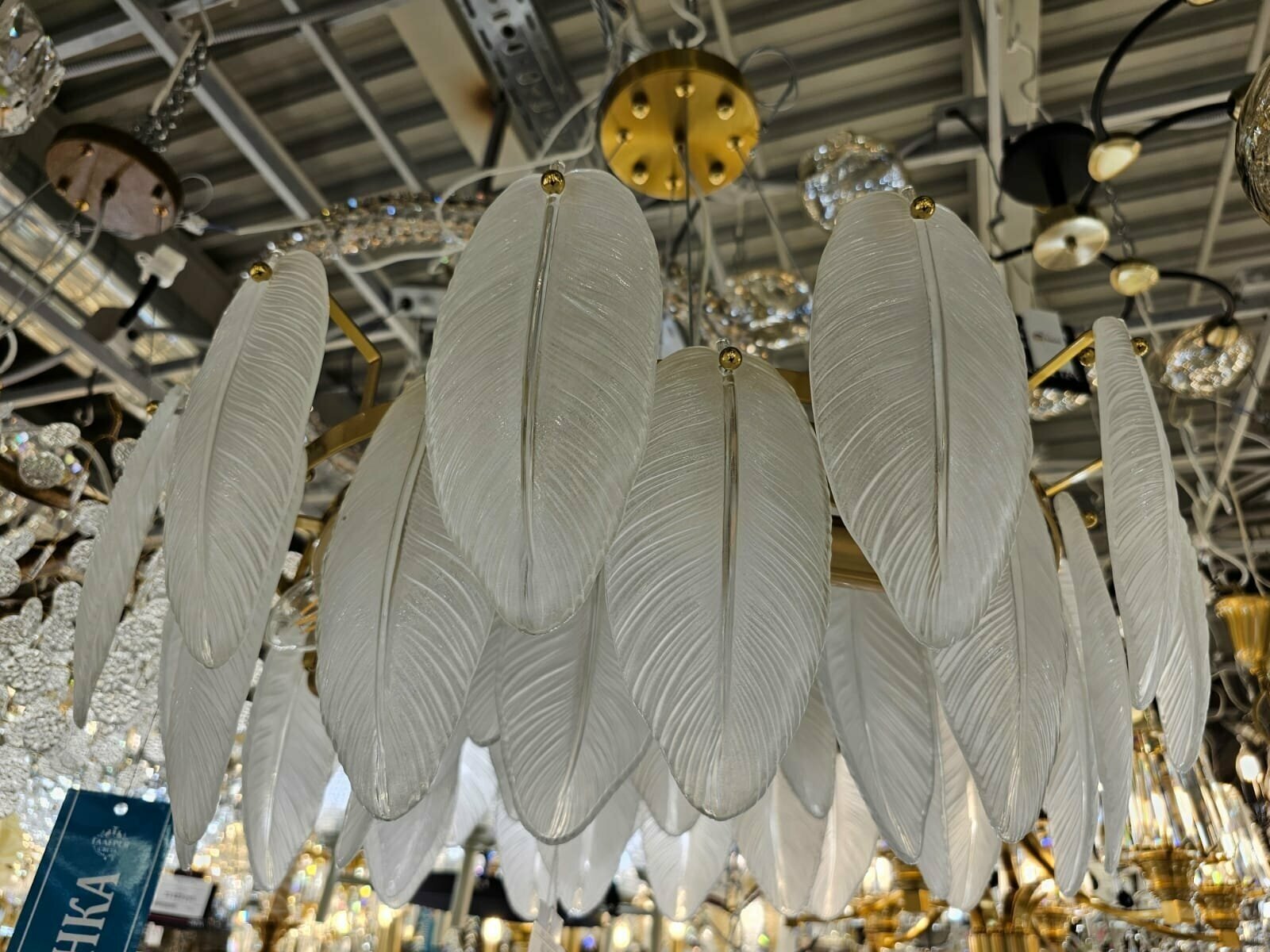Металлическое основание светильника гальванизировано в цвет бронзы. Люстра декорирована матированными стеклянными элементами в форме листьев.