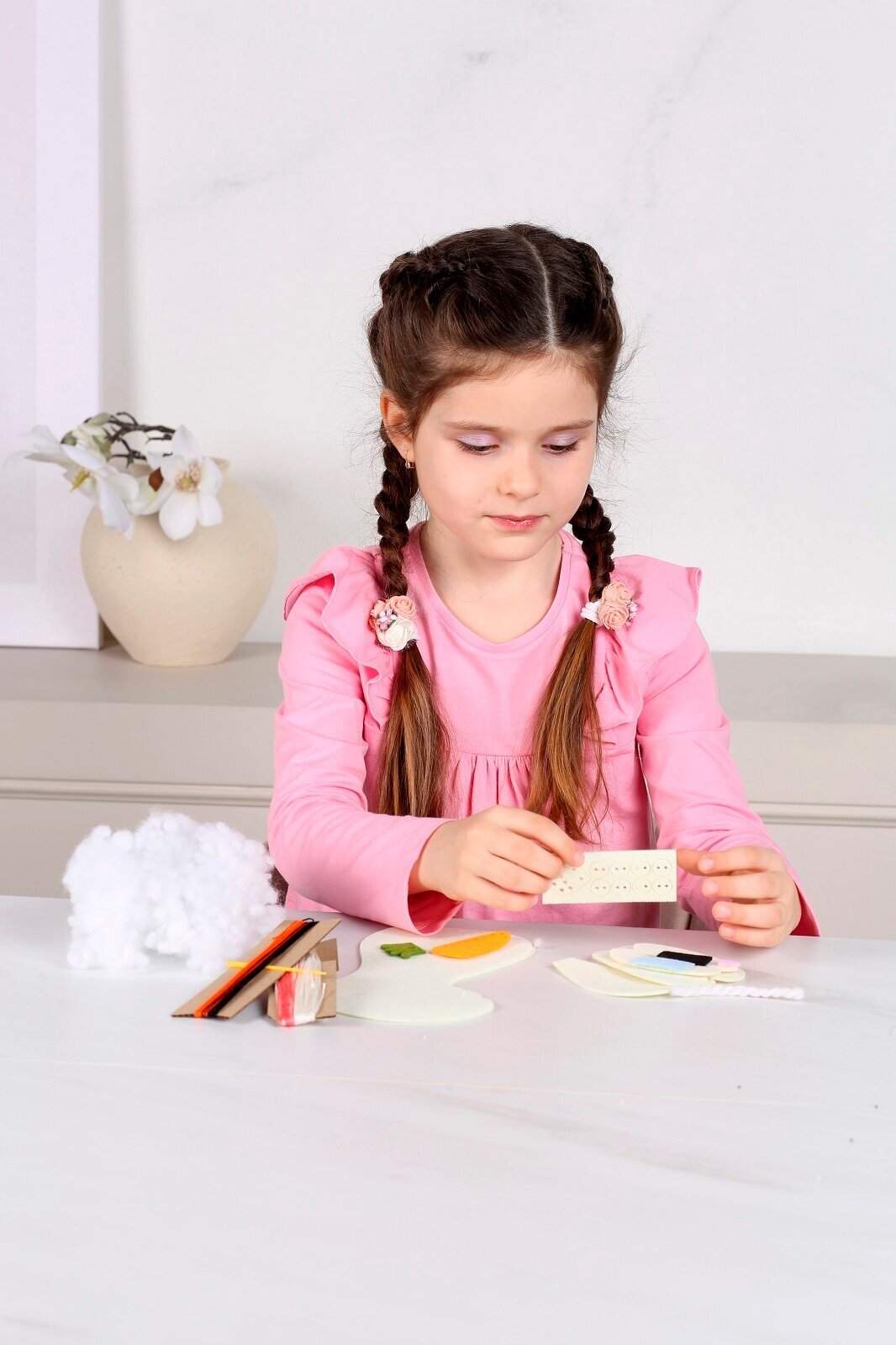 Благодаря перфорированным отверстиям, подробной инструкции и пластиковой безопасной иголке, ребенок сможет самостоятельно сшить мягкую игрушку.