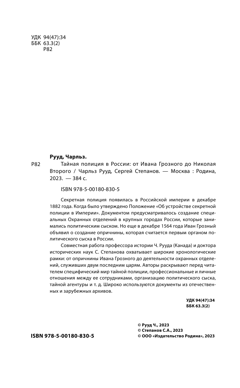Совместная работа профессора истории Ч. Рууда (Канада) и доктора исторических наук С. Степанова охватывает широкие хронологические рамки: от опричнины Ивана Грозного до деятельности охранных отделений, служивших двум последним царям. Авторы раскрывают перед читателем специфический мир тайной полиции, профессиональные и личные отношения между ее сотрудниками, организацию политического сыска, тайной агентуры и т. д. Широко используются документы из отечественных и зарубежных архивов.