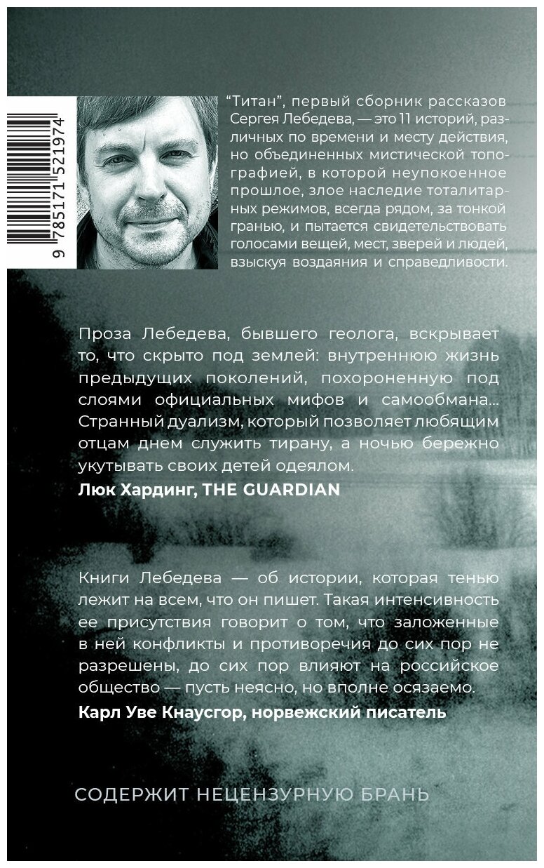 “Титан” – сборник рассказов Сергея Лебедева о зле. Оно не исчезает, не растворяется в воздухе. Если о зле молчать и прятать его, оно навсегда оставляет печать – на доме, на безделушке, на людях. Этот сборник – о замолчанных репрессиях и депортациях, о глухом отчаянии бывших коллаборационистов и неспокойной совести судей.