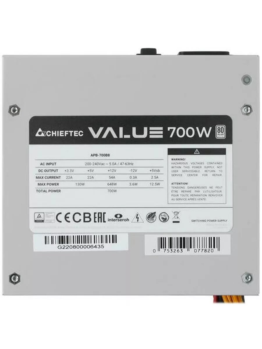 Блок питания Chieftec VALUE 700W оснащен коннекторами 24+4+4, 3xSATA, 1xPCI-E(6+2), которых достаточно для подключения всех необходимых комплектующих системы. Длина кабеля 500 мм обеспечивает удобный доступ и подключение устройств.