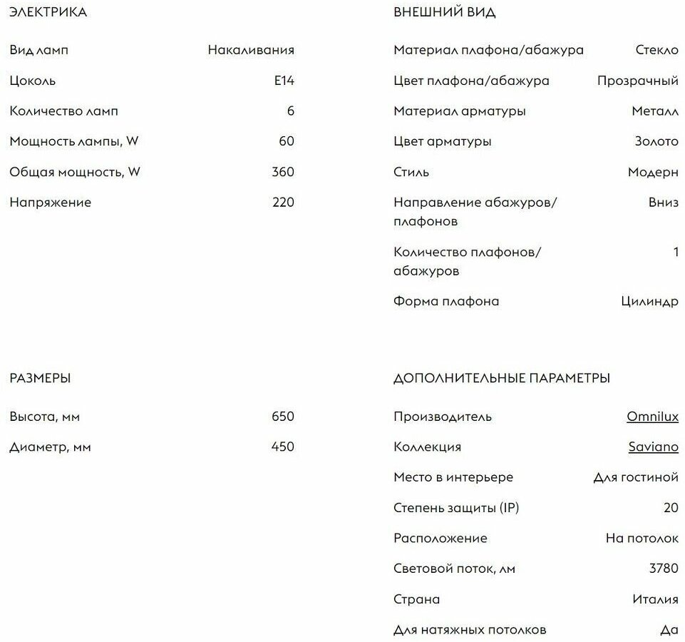 | Цвет плафона | прозрачный |