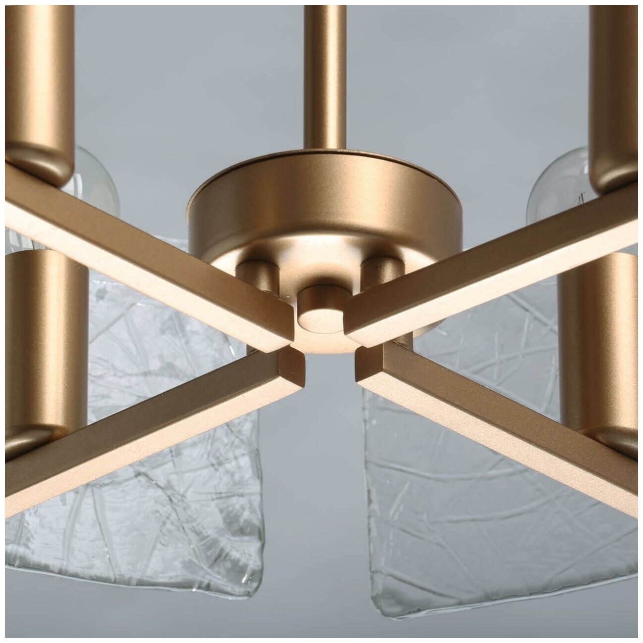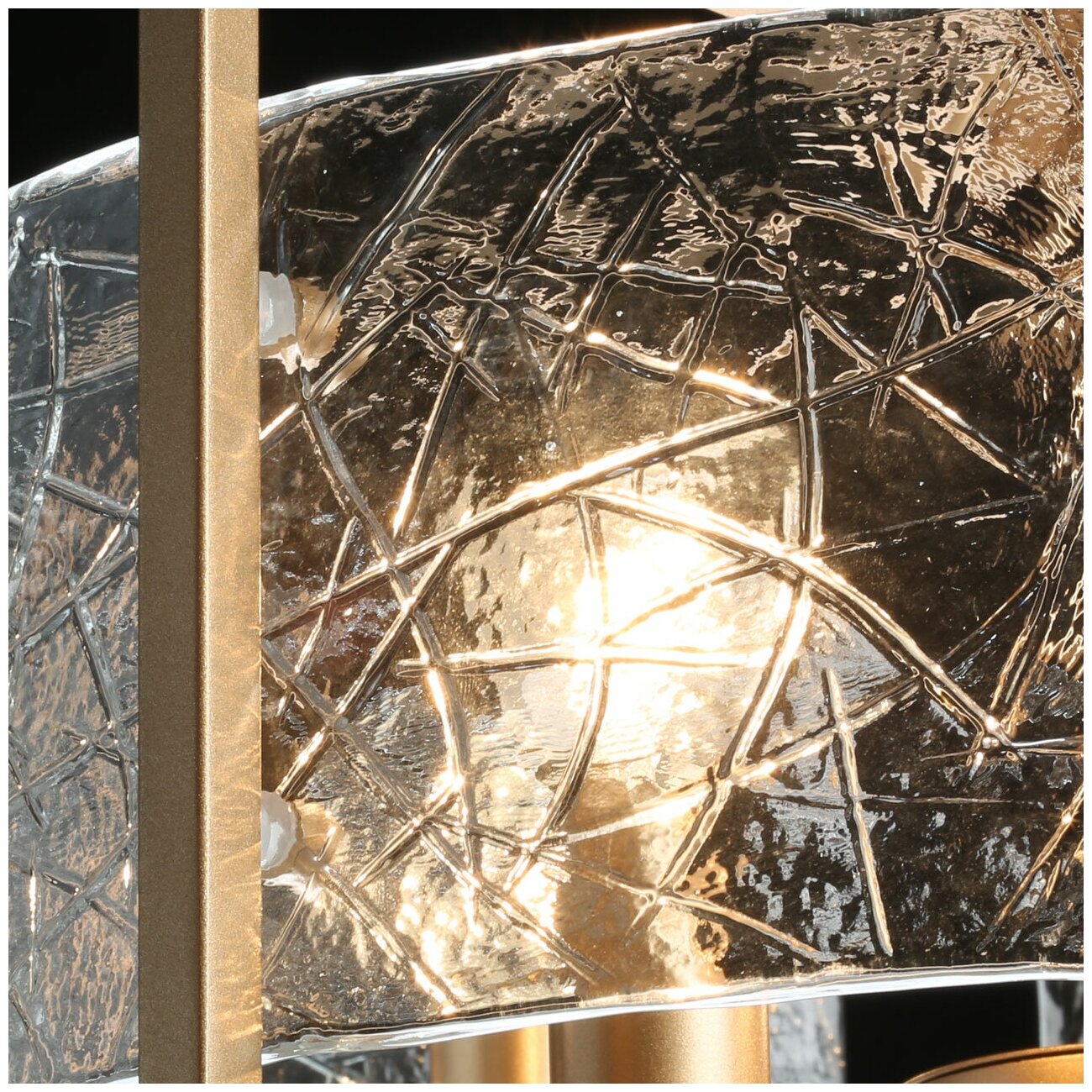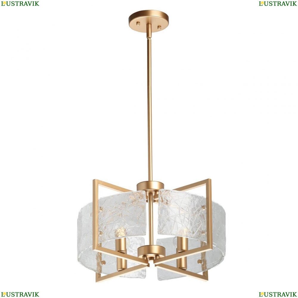 Металлическое основание светильника гальванизировано в цвет золота. Светильник декорирован прозрачными пластинами из фактурного стекла.